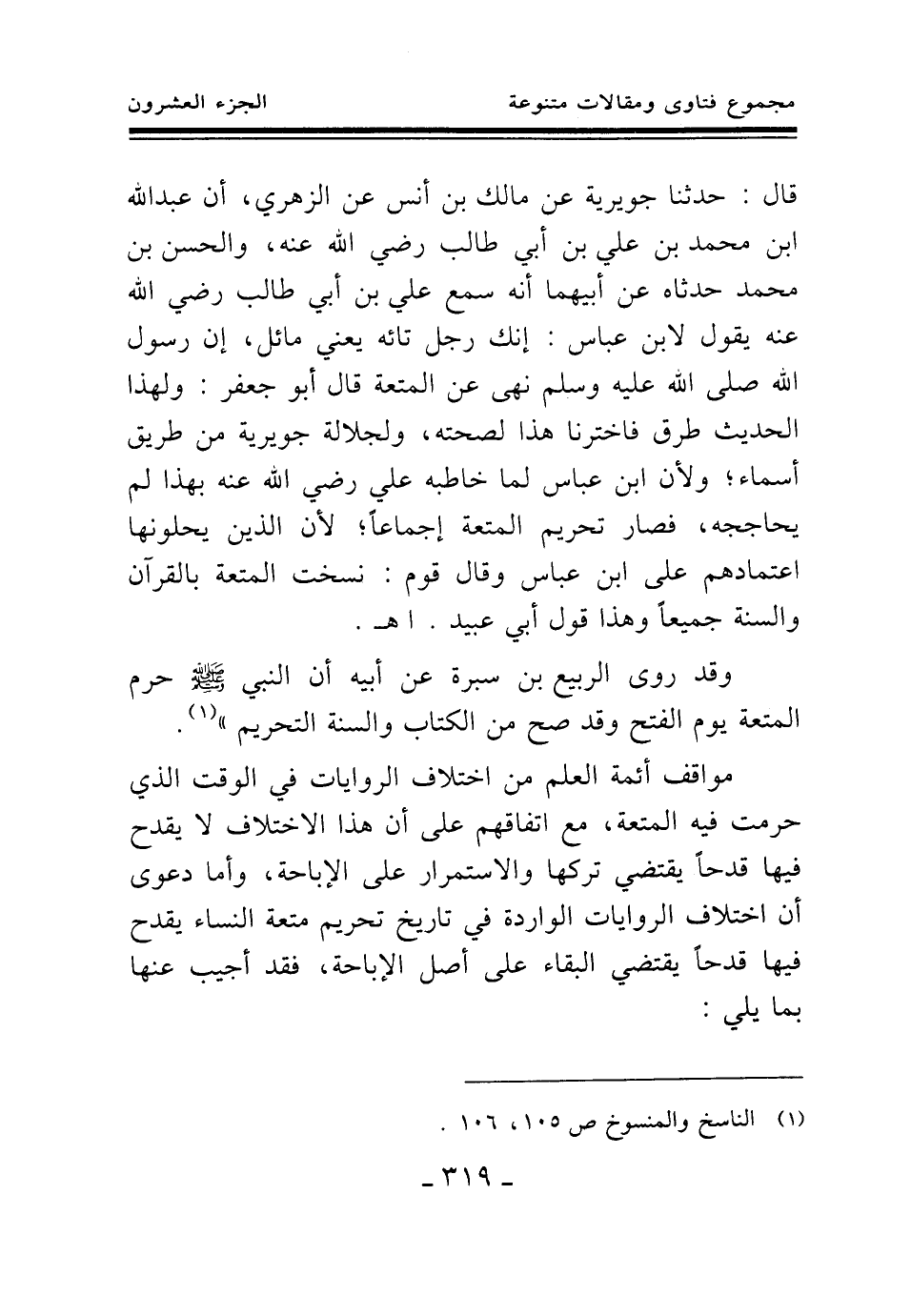 قال: حدثنا جويرية عن مالك بن أنس عن الزهري، أن عبد الله بن محمد بن علي بن أبي طالب رضي الله عنه، والحسن بن محمد حدثاه عن أبيهما أنه سمع علي بن أبي طالب رضي الله عنه يقول لابن عباس: إنك رجل تائه يعني مائل، إن رسول الله صلى الله عليه وسلم نهى عن المتعة، قال أبو جعفر: ولهذا الحديث طرق فاخترنا هذا لصحته، ولجلالة جويرية من طريق أسماء؛ ولأن ابن عباس لما خاطبه علي رضي الله عنه بهذا لم يحاججه، فصار تحريم المتعة إجماعا؛ لأن الذين يحلونها اعتمادهم على ابن عباس، وقال قوم: نسخت المتعة بالقرآن والسنة جميعا وهذا قول أبي عبيد. اهـ.