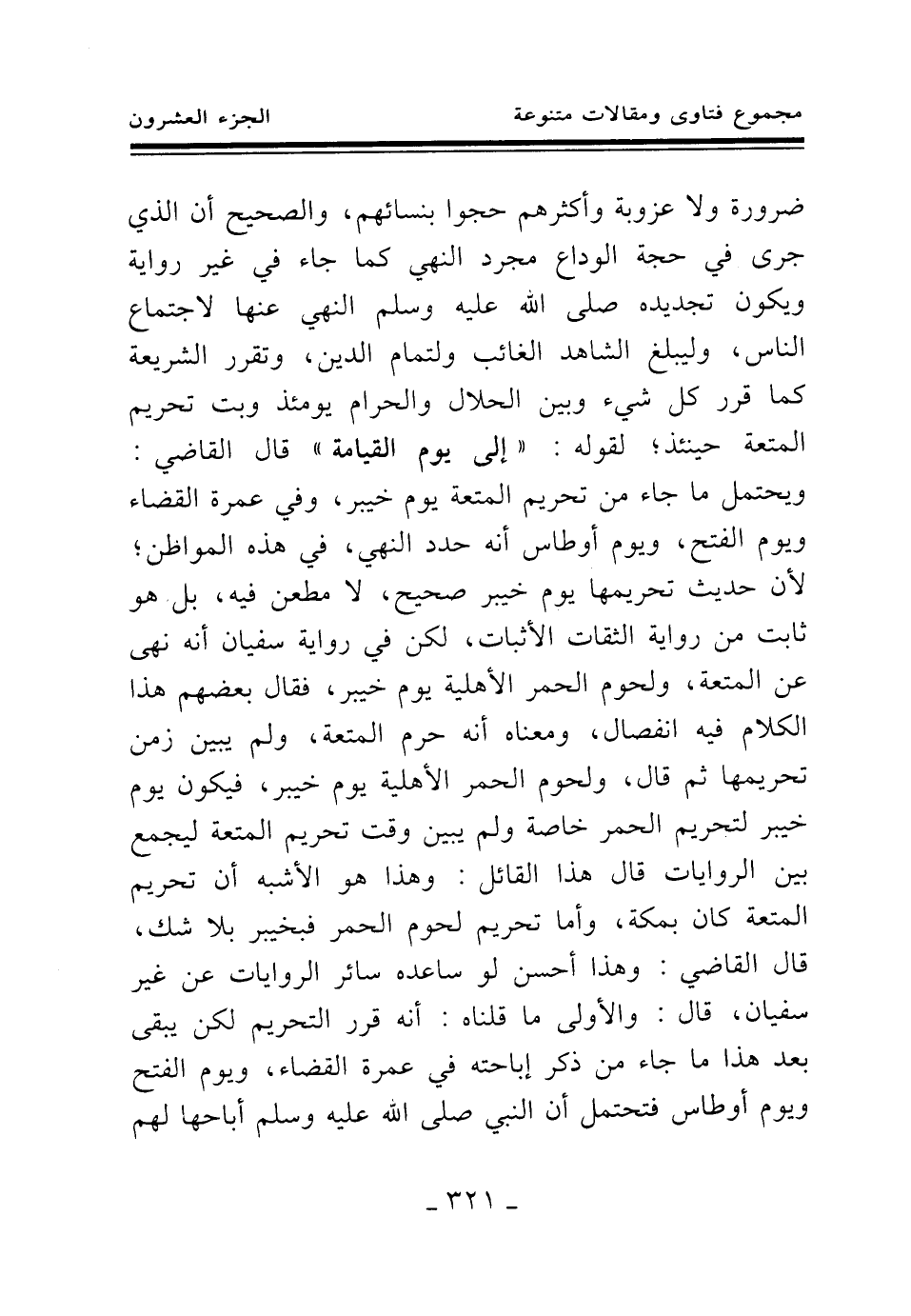 ضرورة ولا عزوبة وأكثرهم حجوا بنسائهم، والصحيح أن الذي جرى في حجة الوداع مجرد النهي كما جاء في غير رواية ويكون تجديده صلى الله عليه وسلم النهي عنها لاجتماع الناس، وليبلغ الشاهد الغائب ولتمام الدين، وتقرر الشريعة كما قرر كل شيء وبين الحلال والحرام يومئذ وبت تحريم المتعة حينئذ؛ لقوله: " إلى يوم القيامة " قال القاضي: ويحتمل ما جاء من تحريم المتعة يوم خيبر، وفي عمرة القضاء ويوم الفتح، ويوم أوطاس أنه حدد النهي، في هذه المواطن؛ لأن حديث تحريمها يوم خيبر صحيح، لا مطعن فيه، بل هو ثابت من رواية الثقات الأثبات، لكن في رواية سفيان أنه نهى عن المتعة، ولحوم الحمر الأهلية يوم خيبر، فقال بعضهم هذا الكلام فيه انفصال، ومعناه أنه حرم المتعة، ولم يبين زمن تحريمها ثم قال: ولحوم الحمر الأهلية يوم خيبر، فيكون يوم خيبر لتحريم الحمر خاصة ولم يبين وقت تحريم المتعة ليجمع بين الروايات قال هذا القائل: وهذا هو الأشبه أن تحريم المتعة كان بمكة، وأما تحريم لحوم الحمر فبخيبر بلا شك، قال القاضي: وهذا أحسن لو ساعده سائر الروايات عن غير سفيان، قال: والأولى ما قلناه: أنه قرر التحريم لكن يبقى بعد هذا ما جاء من ذكر إباحته في عمرة القضاء، ويوم الفتح ويوم أوطاس فتحتمل أن النبي صلى الله عليه وسلم أباحها لهم
