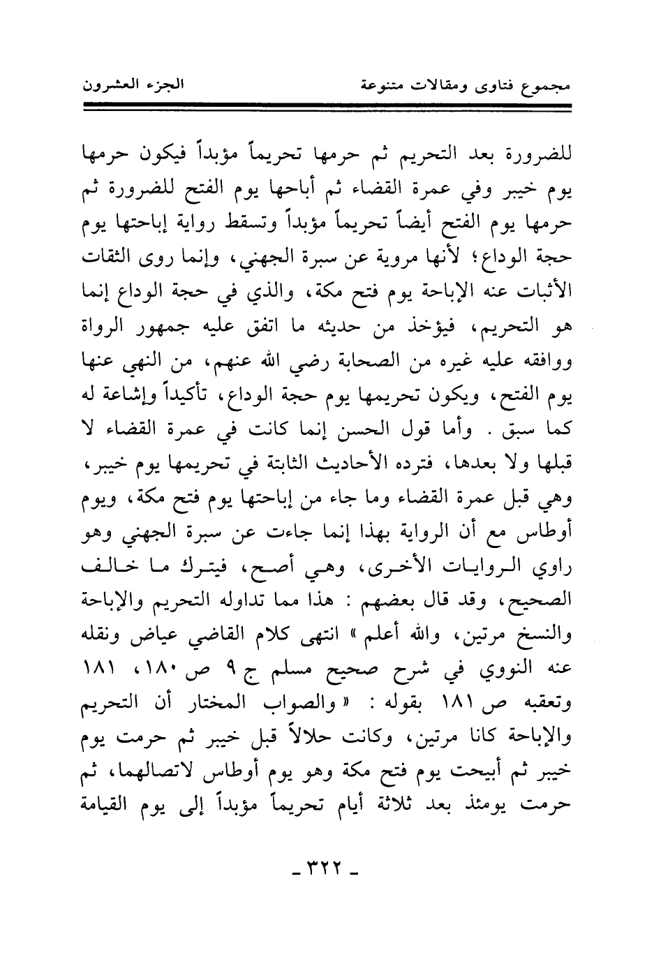 للضرورة بعد التحريم ثم حرمها تحريما مؤبدا فيكون حرمها يوم خيبر وفي عمرة القضاء ثم أباحها يوم الفتح للضرورة ثم حرمها يوم الفتح أيضا تحريما مؤبدا وتسقط رواية إباحتها يوم حجة الوداع؛ لأنها مروية عن سبرة الجهني، وإنما روى الثقات الأثبات عنه الإباحة يوم فتح مكة، والذي في حجة الوداع إنما هو التحريم، فيؤخذ من حديثه ما اتفق عليه جمهور الرواة ووافقه عليه غيره من الصحابة رضي الله عنهم، من النهي عنها يوم الفتح، ويكون تحريمها يوم حجة الوداع، تأكيدا وإشاعة له كما سبق. وأما قول الحسن: إنما كانت في عمرة القضاء لا قبلها ولا بعدها، فترده الأحاديث الثابتة في تحريمها يوم خيبر، وهي قبل عمرة القضاء وما جاء من إباحتها يوم فتح مكة، ويوم أوطاس مع أن الرواية بهذا إنما جاءت عن سبرة الجهني وهو راوي الروايات الأخرى، وهي أصح، فيترك ما خالف الصحيح، وقد قال بعضهم: هذا مما تداوله التحريم والإباحة والنسخ مرتين، والله أعلم " انتهى كلام القاضي عياض ونقله عنه النووي في شرح صحيح مسلم ج 9 ص 180، 181 وتعقبه ص 181 بقوله: " والصواب المختار أن التحريم والإباحة كانا مرتين، وكانت حلالا قبل خيبر ثم حرمت يوم خيبر ثم أبيحت يوم فتح مكة وهو يوم أوطاس لاتصالهما، ثم حرمت يومئذ بعد ثلاثة أيام تحريما مؤبدا إلى يوم القيامة
