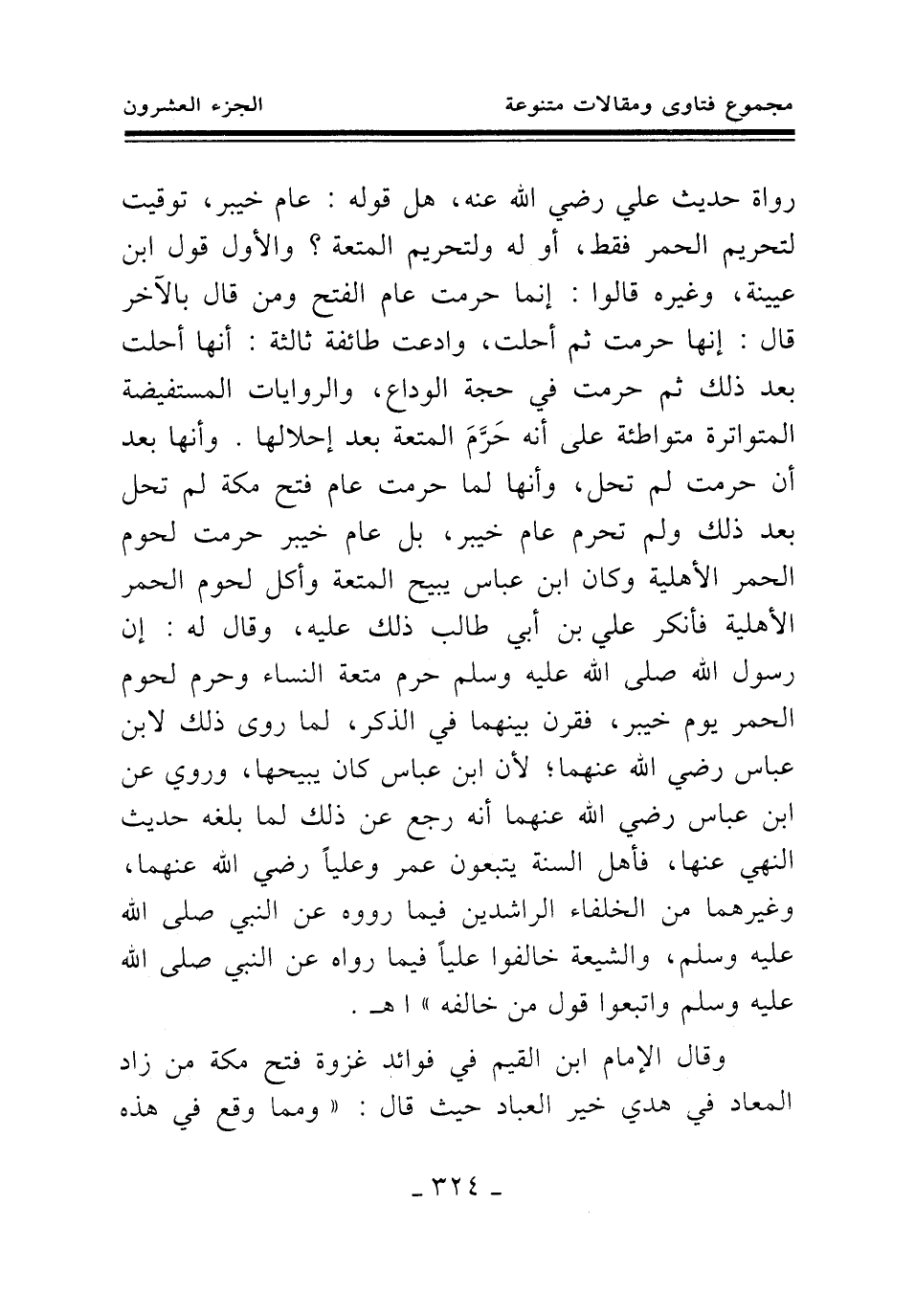 رواة حديث علي رضي الله عنه، هل قوله: عام خيبر، توقيت لتحريم الحمر فقط، أو له ولتحريم المتعة؟ والأول قول ابن عيينة، وغيره قالوا: إنما حرمت عام الفتح ومن قال بالآخر قال: إنها حرمت ثم أحلت، وادعت طائفة ثالثة: أنها أحلت بعد ذلك ثم حرمت في حجة الوداع، والروايات المستفيضة المتواترة متواطئة على أنه حرم المتعة بعد إحلالها. وأنها بعد أن حرمت لم تحل، وأنها لما حرمت عام فتح مكة لم تحل بعد ذلك ولم تحرم عام خيبر، بل عام خيبر حرمت لحوم الحمر الأهلية وكان ابن عباس يبيح المتعة وأكل لحوم الحمر الأهلية فأنكر علي بن أبي طالب ذلك عليه، وقال له: «إن رسول الله صلى الله عليه وسلم حرم متعة النساء وحرم لحوم الحمر يوم خيبر (¬1) » فقرن بينهما في الذكر، لما روى ذلك لابن عباس رضي الله عنهما؛ لأن ابن عباس كان يبيحها، وروي عن ابن عباس رضي الله عنهما أنه رجع عن ذلك لما بلغه حديث النهي عنها، فأهل السنة يتبعون عمر وعليا رضي الله عنهما، وغيرهما من الخلفاء الراشدين فيما رووه عن النبي صلى الله عليه وسلم، والشيعة خالفوا عليا فيما رواه عن النبي صلى الله عليه وسلم واتبعوا قول من خالفه " اهـ.