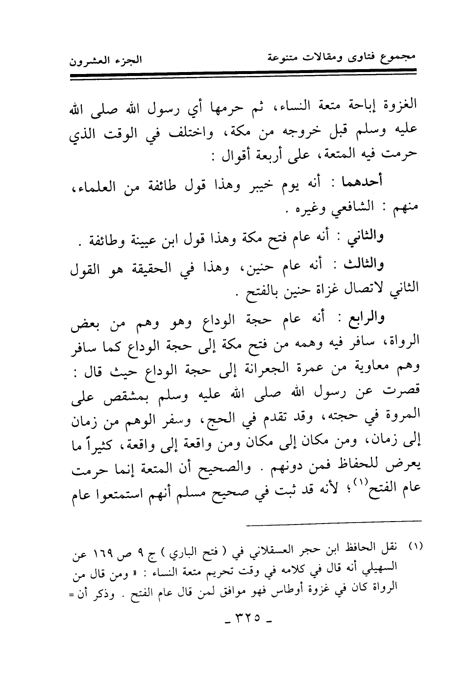 والرابع: أنه عام حجة الوداع وهو وهم من بعض الرواة، سافر فيه وهمه من فتح مكة إلى حجة الوداع كما سافر وهم معاوية من عمرة الجعرانة إلى حجة الوداع حيث قال: قصرت عن رسول الله صلى الله عليه وسلم بمشقص على المروة في حجته، وقد تقدم في الحج، وسفر الوهم من زمان إلى زمان، ومن مكان إلى مكان ومن واقعة إلى واقعة، كثيرا ما يعرض للحفاظ فمن دونهم. والصحيح أن المتعة إنما حرمت عام الفتح؛ لأنه قد ثبت في صحيح مسلم أنهم استمتعوا عام