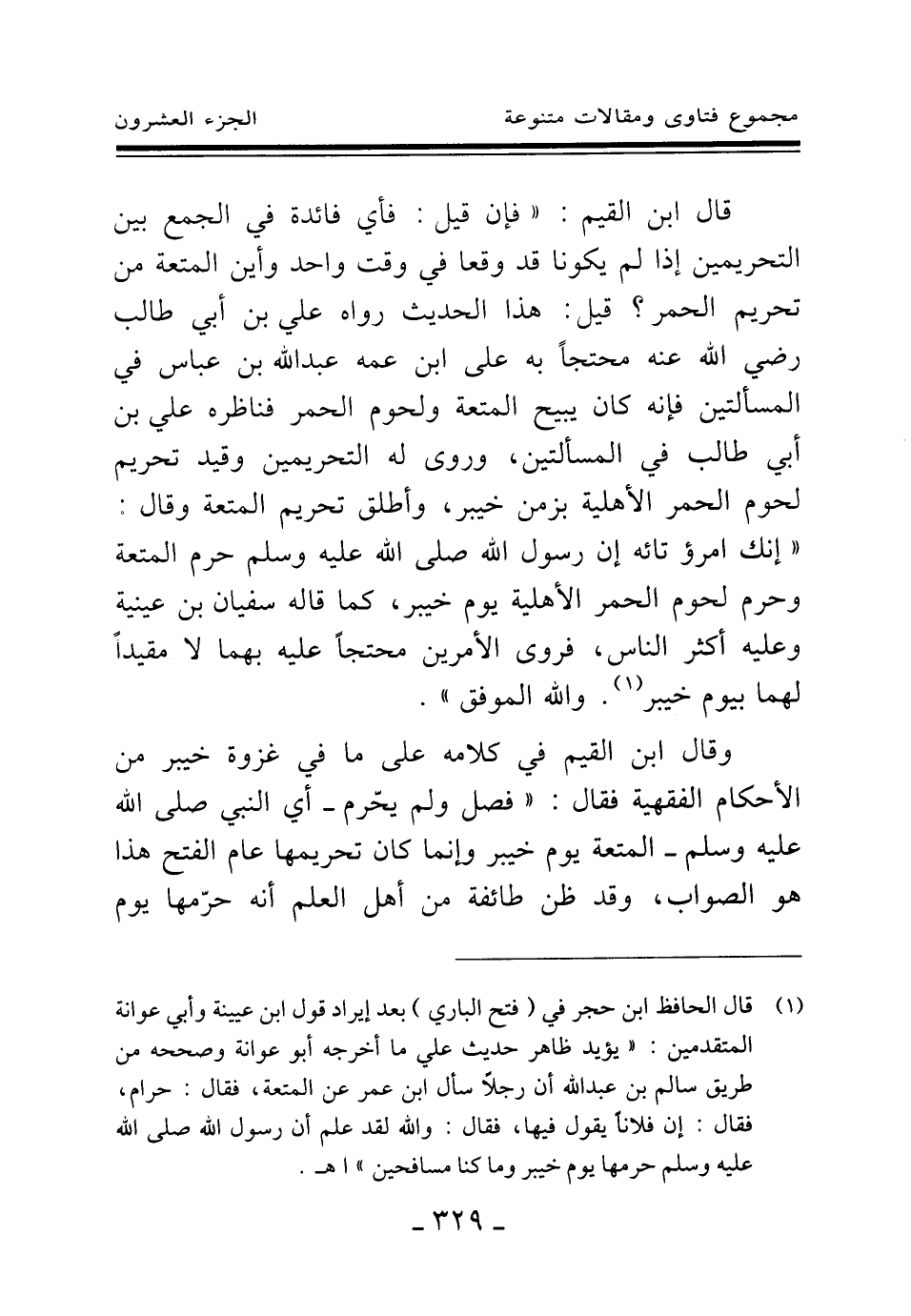 قال ابن القيم: " فإن قيل: فأي فائدة في الجمع بين التحريمين إذا لم يكونا قد وقعا في وقت واحد وأين المتعة من تحريم الحمر؟ قيل: هذا الحديث رواه علي بن أبي طالب رضي الله عنه محتجا به على ابن عمه عبد الله بن عباس في المسألتين فإنه كان يبيح المتعة ولحوم الحمر فناظره علي بن أبي طالب في المسألتين، وروى له التحريمين وقيد تحريم لحوم الحمر الأهلية بزمن خيبر، وأطلق تحريم المتعة وقال: «إنك امرؤ تائه إن رسول الله صلى الله عليه وسلم حرم المتعة وحرم لحوم الحمر الأهلية يوم خيبر (¬1) » كما قاله سفيان بن عينية وعليه أكثر الناس، فروى الأمرين محتجا عليه بهما لا مقيدا لهما بيوم خيبر والله الموفق ".