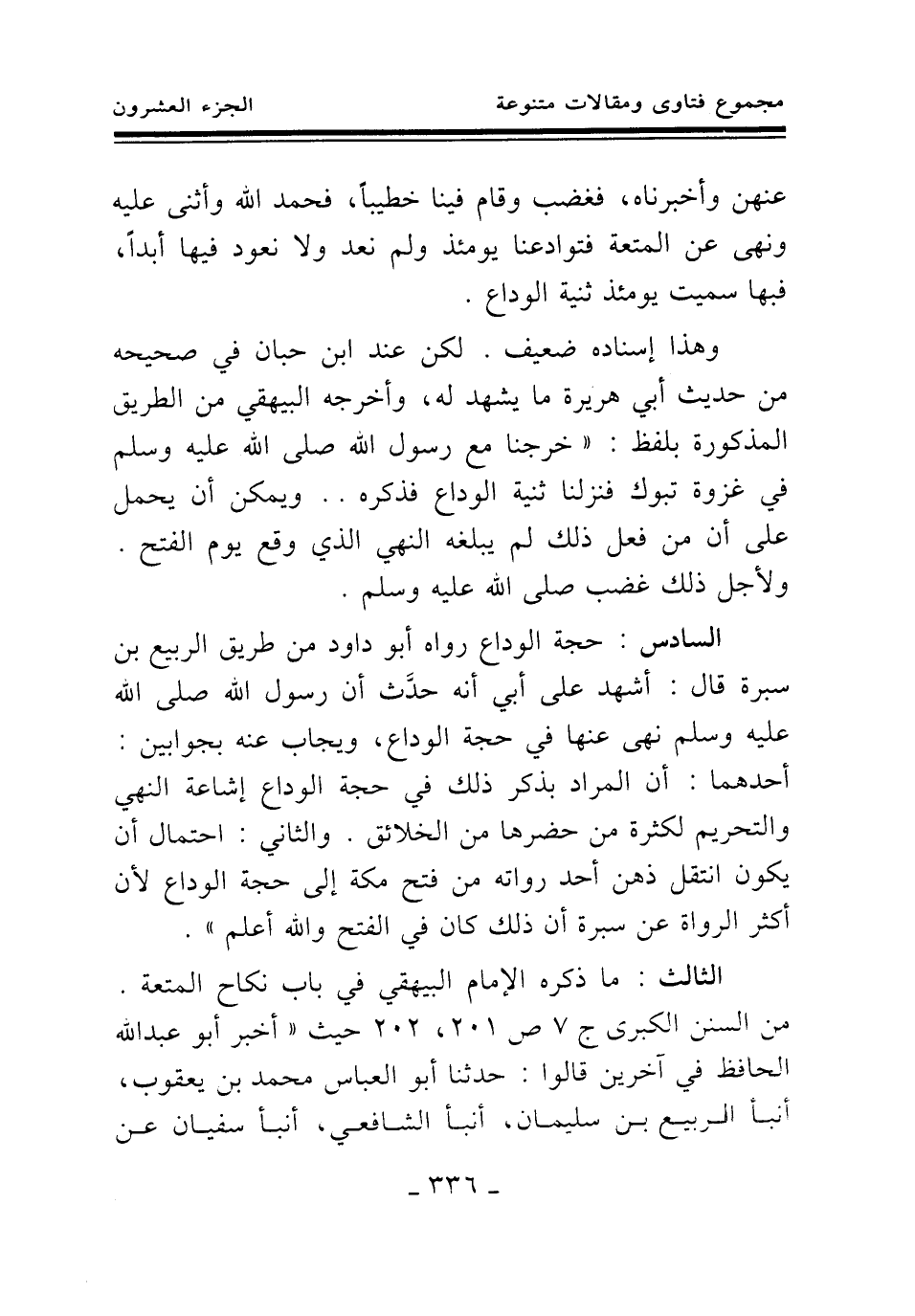 الثالث: ما ذكره الإمام البيهقي في باب نكاح المتعة. من السنن الكبرى ج 7 ص 201، 202 حيث " أخبر أبو عبد الله الحافظ في آخرين قالوا: حدثنا أبو العباس محمد بن يعقوب، أنبأ الربيع بن سليمان، أنبأ الشافعي، أنبأ سفيان عن