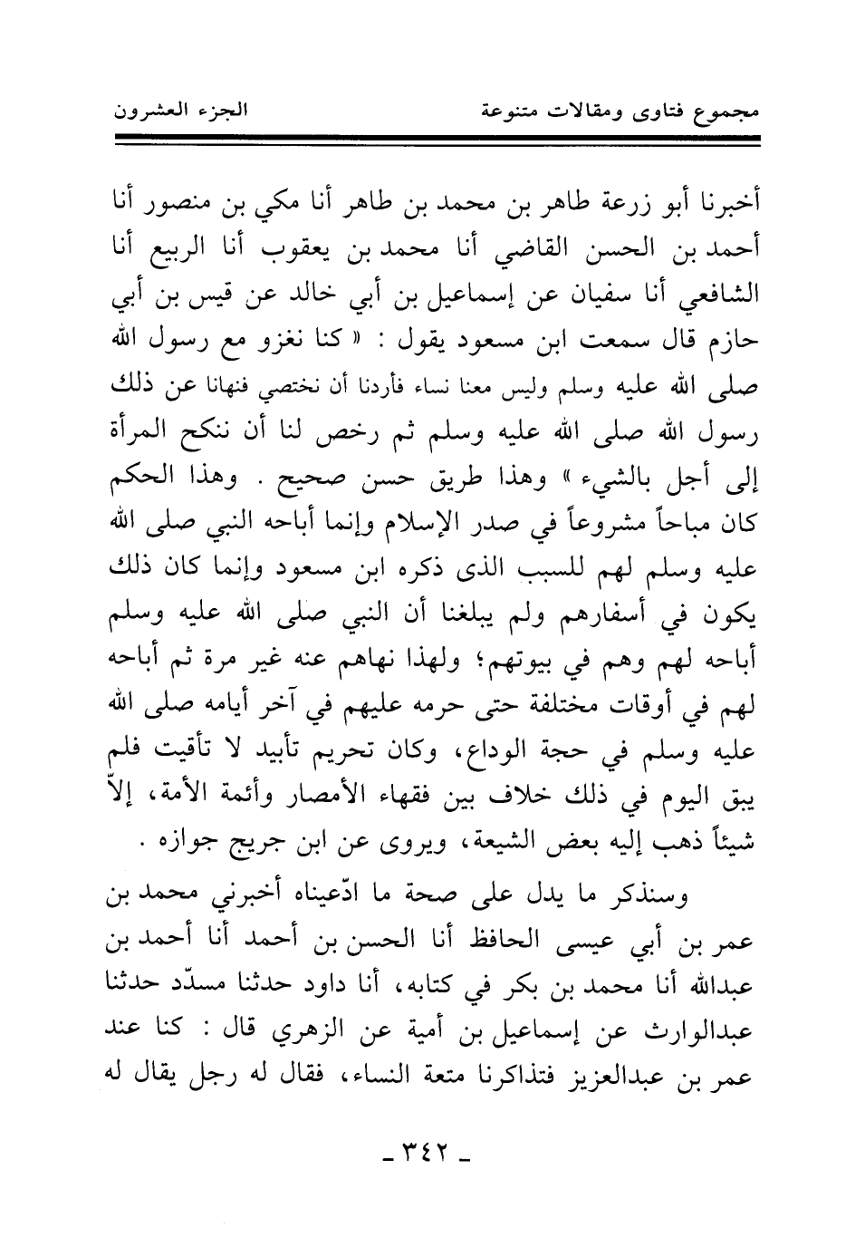 أخبرنا أبو زرعة طاهر بن محمد بن طاهر أنا مكي بن منصور أنا أحمد بن الحسن القاضي أنا محمد بن يعقوب أنا الربيع أنا الشافعي أنا سفيان عن إسماعيل بن أبي خالد عن قيس بن أبي حازم قال: سمعت ابن مسعود يقول: «كنا نغزو مع رسول الله صلى الله عليه وسلم وليس معنا نساء فأردنا أن نختصي فنهانا عن ذلك رسول الله صلى الله عليه وسلم ثم رخص لنا أن ننكح المرأة إلى أجل بالشيء (¬1) » وهذا طريق حسن صحيح. وهذا الحكم كان مباحا مشروعا في صدر الإسلام وإنما أباحه النبي صلى الله عليه وسلم لهم للسبب الذي ذكره ابن مسعود وإنما كان ذلك يكون في أسفارهم ولم يبلغنا أن النبي صلى الله عليه وسلم أباحه لهم وهم في بيوتهم؛ ولهذا نهاهم عنه غير مرة ثم أباحه لهم في أوقات مختلفة حتى حرمه عليهم في آخر أيامه صلى الله عليه وسلم في حجة الوداع، وكان تحريم تأبيد لا تأقيت فلم يبق اليوم في ذلك خلاف بين فقهاء الأمصار وأئمة الأمة، إلا شيئا ذهب إليه بعض الشيعة، ويروى عن ابن جريج جوازه.