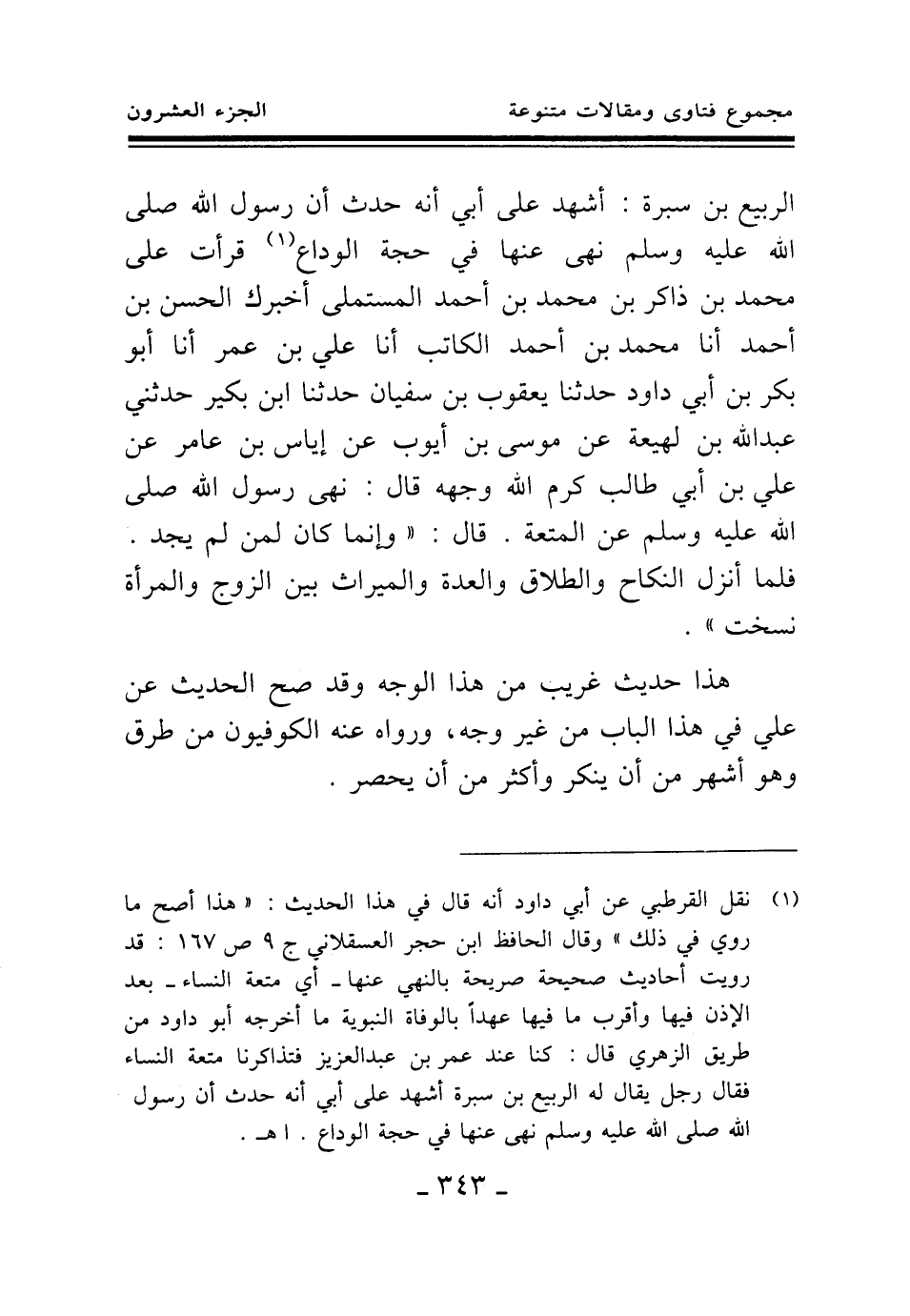 (¬1) نقل القرطبي عن أبي داود أنه قال في هذا الحديث: '' هذا أصح ما روي في ذلك '' وقال الحافظ ابن حجر العسقلاني ج 9 ص 167: قد رويت أحاديث صحيحة صريحة بالنهي عنها - أي متعة النساء - بعد الإذن فيها وأقرب ما فيها عهدا بالوفاة النبوية ما أخرجه أبو داود من طريق الزهر