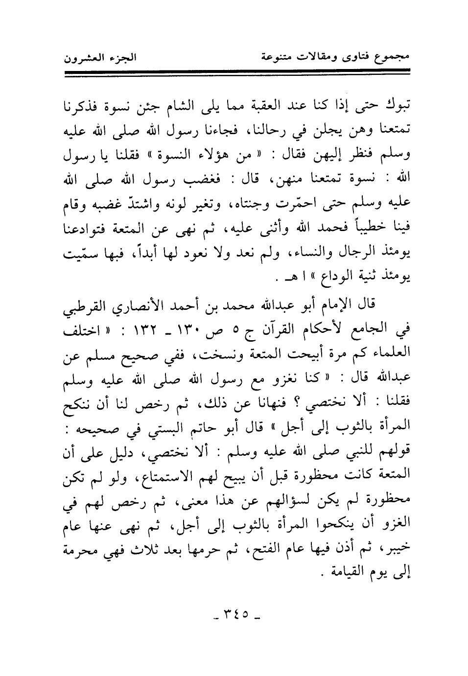 قال الإمام أبو عبد الله محمد بن أحمد الأنصاري القرطبي في الجامع لأحكام القرآن ج 5 ص 130 - 132: " اختلف العلماء كم مرة أبيحت المتعة ونسخت، ففي صحيح مسلم عن عبد الله قال: «كنا نغزو مع رسول الله صلى الله عليه وسلم فقلنا: ألا نختصي؟ فنهانا عن ذلك، ثم رخص لنا أن ننكح المرأة بالثوب إلى أجل (¬1) » قال أبو حاتم البستي في صحيحه: قولهم للنبي صلى الله عليه وسلم: ألا نختصي، دليل على أن المتعة كانت محظورة قبل أن يبيح لهم الاستمتاع، ولو لم تكن محظورة لم يكن لسؤالهم عن هذا معنى، ثم رخص لهم في الغزو أن ينكحوا المرأة بالثوب إلى أجل، ثم نهى عنها عام خيبر، ثم أذن فيها عام الفتح، ثم حرمها بعد ثلاث فهي محرمة إلى يوم القيامة.