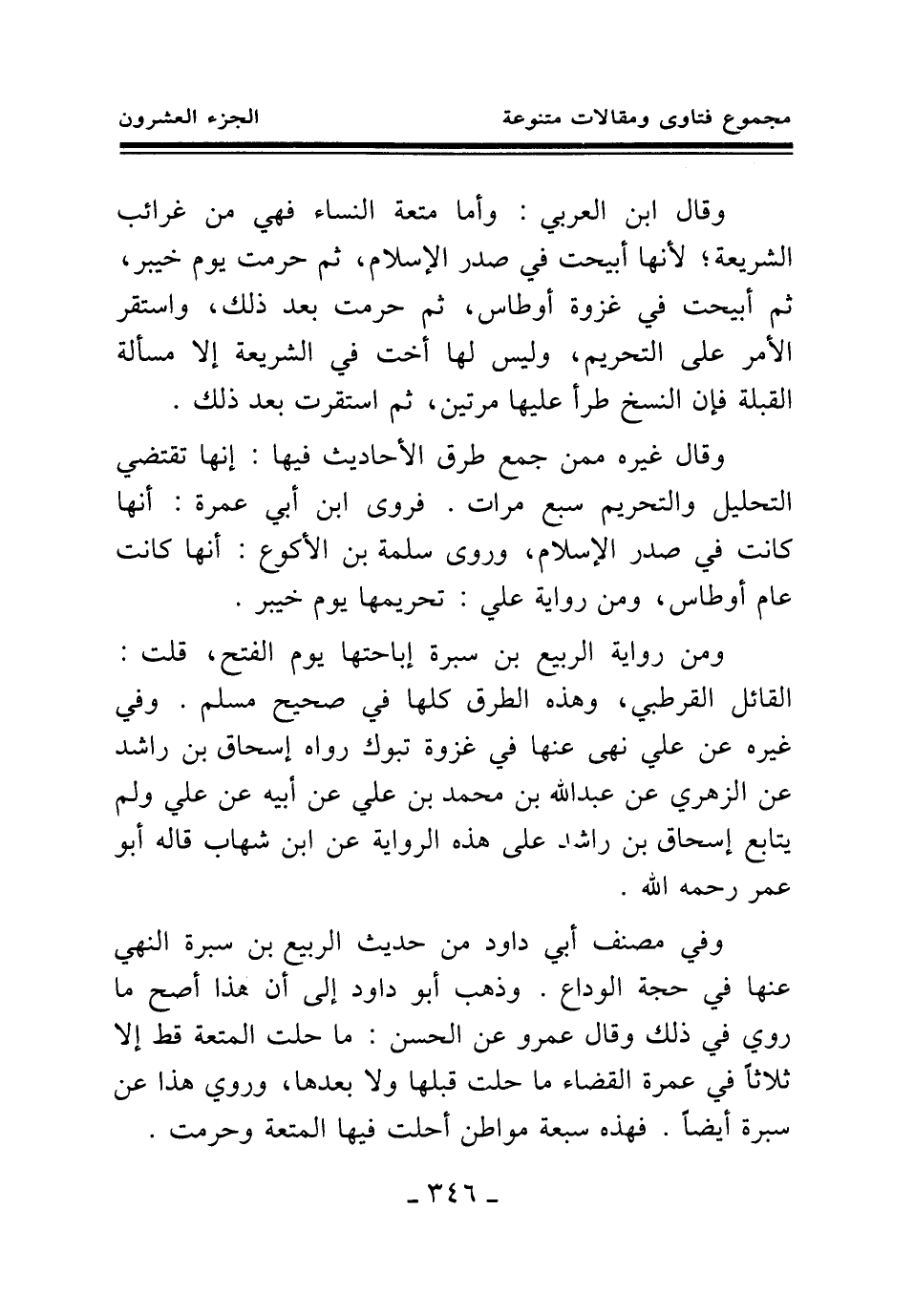 وقال ابن العربي: وأما متعة النساء فهي من غرائب الشريعة؛ لأنها أبيحت في صدر الإسلام، ثم حرمت يوم خيبر، ثم أبيحت في غزوة أوطاس، ثم حرمت بعد ذلك، واستقر الأمر على التحريم، وليس لها أخت في الشريعة إلا مسألة القبلة فإن النسخ طرأ عليها مرتين، ثم استقرت بعد ذلك.
