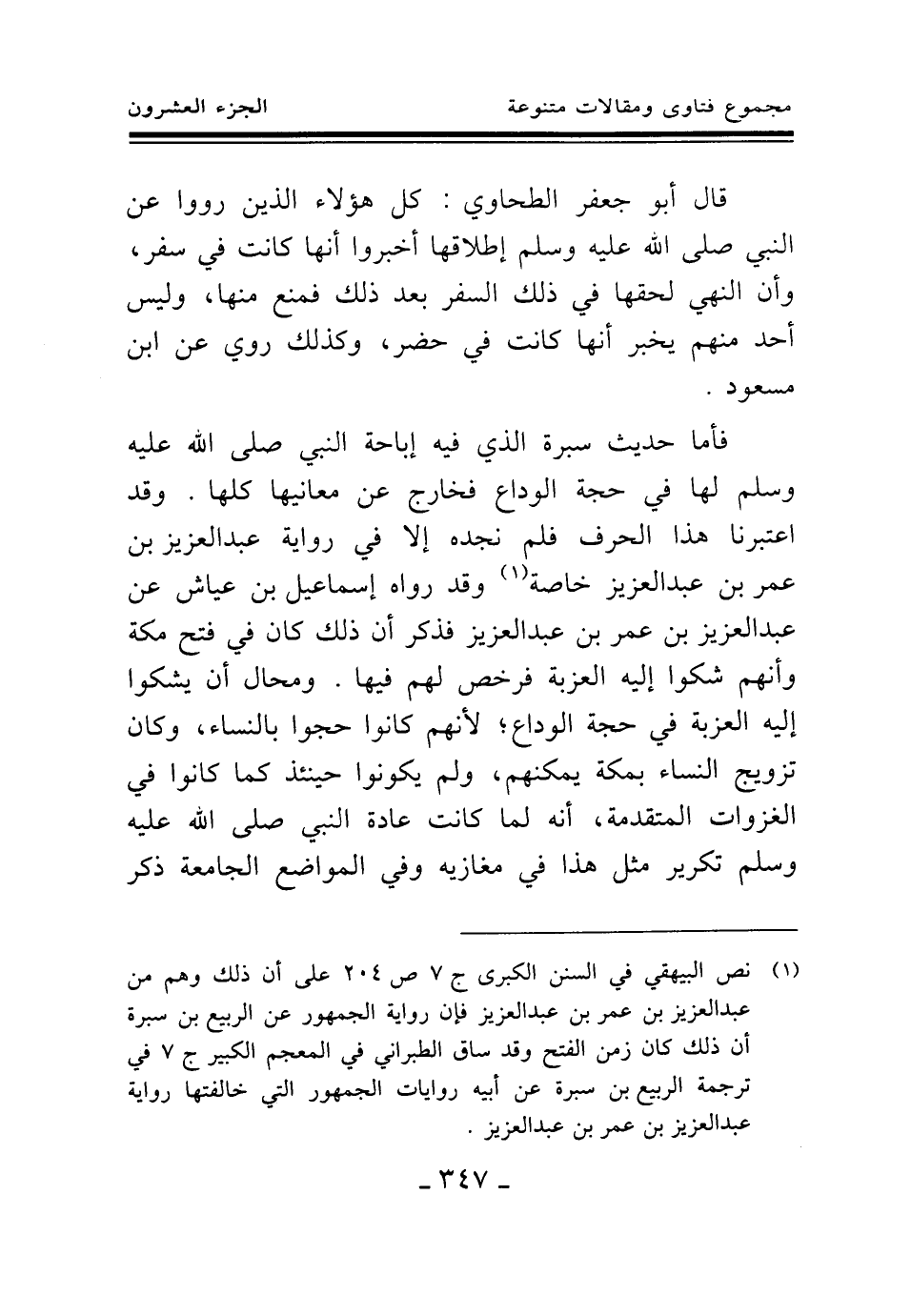 فأما حديث سبرة الذي فيه إباحة النبي صلى الله عليه وسلم لها في حجة الوداع فخارج عن معانيها كلها. وقد اعتبرنا هذا الحرف فلم نجده إلا في رواية عبد العزيز بن عمر بن عبد العزيز خاصة وقد رواه إسماعيل بن عياش عن عبد العزيز بن عمر بن عبد العزيز فذكر أن ذلك كان في فتح مكة وأنهم شكوا إليه العزبة فرخص لهم فيها. ومحال أن يشكوا إليه العزبة في حجة الوداع؛ لأنهم كانوا حجوا بالنساء، وكان تزويج النساء بمكة يمكنهم، ولم يكونوا حينئذ كما كانوا في الغزوات المتقدمة، أنه لما كانت عادة النبي صلى الله عليه وسلم تكرير مثل هذا في مغازيه وفي المواضع الجامعة ذكر