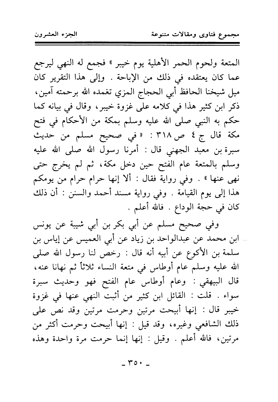 المتعة ولحوم الحمر الأهلية يوم خيبر (¬1) » فجمع له النهي ليرجع عما كان يعتقده في ذلك من الإباحة. وإلى هذا التقرير كان ميل شيخنا الحافظ أبي الحجاج المزي تغمده الله برحمته آمين، ذكر ابن كثير هذا في كلامه على غزوة خيبر، وقال في بيانه كما حكم به النبي صلى الله عليه وسلم بمكة من الأحكام في فتح مكة قال ج 4 ص 318: " في صحيح مسلم من حديث سبرة بن معبد الجهني قال: «أمرنا رسول الله صلى الله عليه وسلم بالمتعة عام الفتح حين دخل مكة، ثم لم يخرج حتى نهى عنها (¬2) » . وفي رواية فقال: «ألا إنها حرام حرام من يومكم هذا إلى يوم القيامة (¬3) » . وفي رواية مسند أحمد والسنن: أن ذلك كان في حجة الوداع. فالله أعلم.