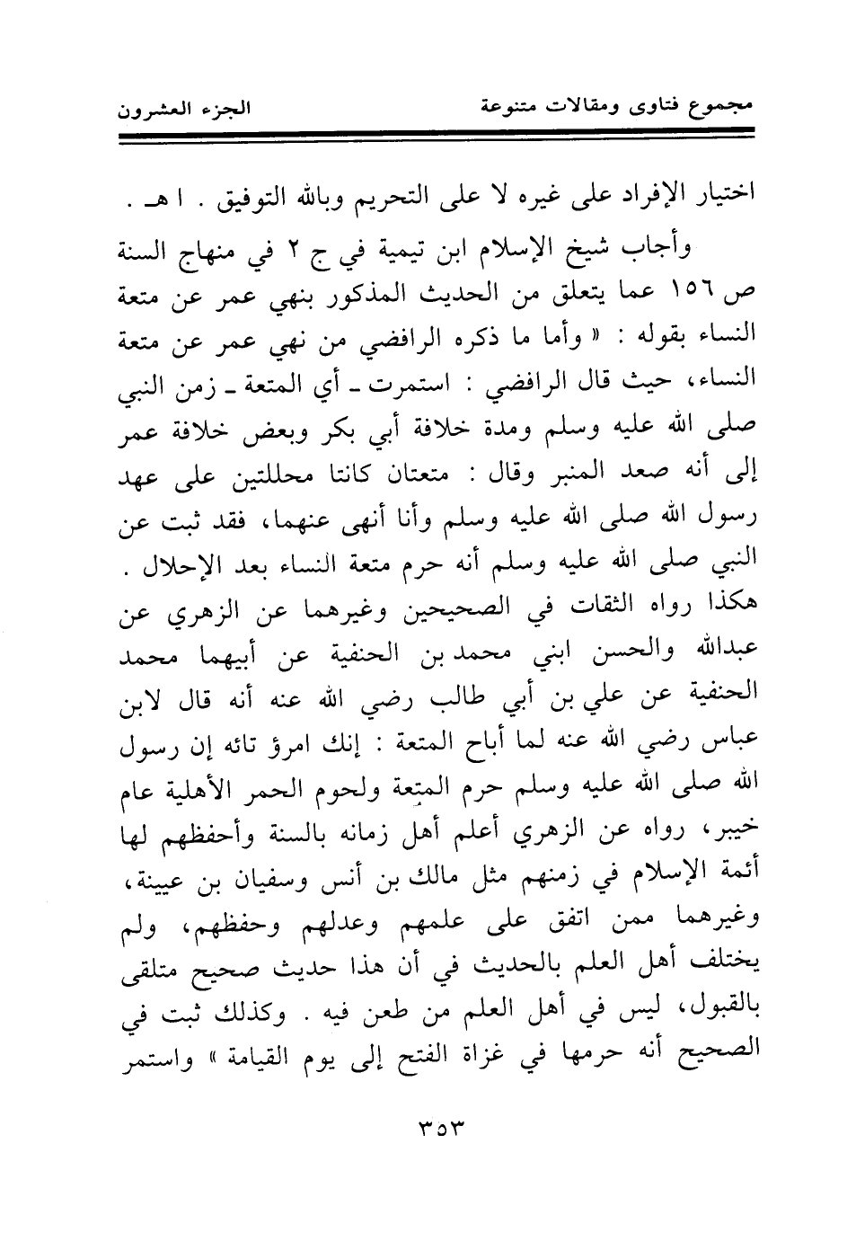 وأجاب شيخ الإسلام ابن تيمية في ج 2 في منهاج السنة ص 156 عما يتعلق من الحديث المذكور بنهي عمر عن متعة النساء بقوله: " وأما ما ذكره الرافضي من نهي عمر عن متعة النساء، حيث قال الرافضي: استمرت - أي المتعة - زمن النبي صلى الله عليه وسلم ومدة خلافة أبي بكر وبعض خلافة عمر إلى أنه صعد المنبر وقال: متعتان كانتا محللتين على عهد رسول الله صلى الله عليه وسلم وأنا أنهى عنهما، فقد ثبت عن النبي صلى الله عليه وسلم «أنه حرم متعة النساء بعد الإحلال (¬1) » . هكذا رواه الثقات في الصحيحين وغيرهما عن الزهري عن عبد الله والحسن ابني محمد بن الحنفية عن أبيهما محمد بن الحنفية «عن علي بن أبي طالب رضي الله عنه أنه قال لابن عباس رضي الله عنه لما أباح المتعة: إنك امرؤ تائه إن رسول الله صلى الله عليه وسلم حرم المتعة ولحوم الحمر الأهلية عام خيبر (¬2) » رواه عن الزهري أعلم أهل زمانه بالسنة وأحفظهم لها أئمة الإسلام في زمنهم مثل مالك بن أنس وسفيان بن عيينة، وغيرهما ممن اتفق على علمهم وعدلهم وحفظهم، ولم يختلف أهل العلم بالحديث في أن هذا حديث صحيح متلقى بالقبول، ليس في أهل العلم من طعن فيه. وكذلك ثبت في الصحيح أنه حرمها في غزوة الفتح إلى يوم القيامة " واستمر