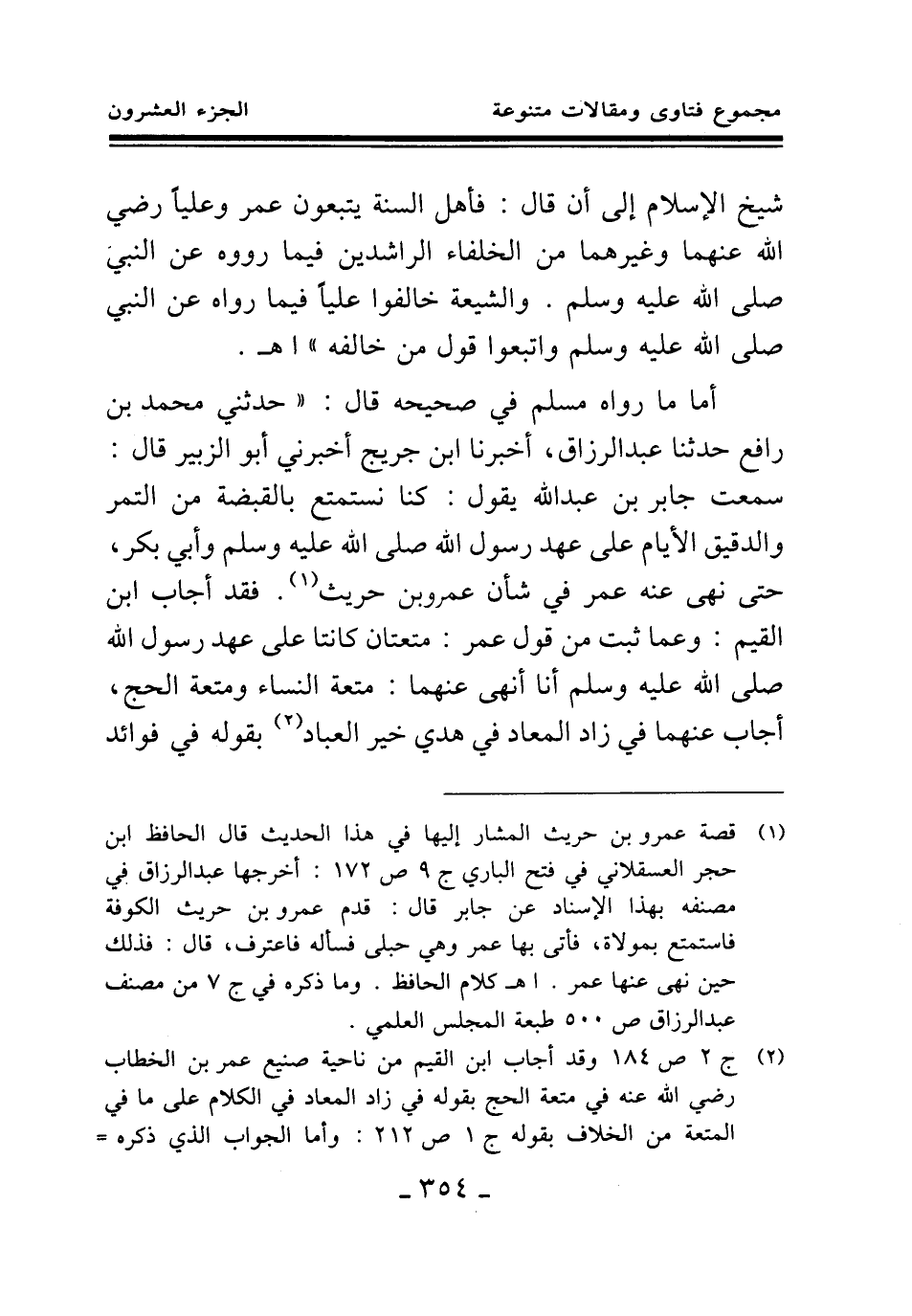 أما ما رواه مسلم في صحيحه قال: " حدثني محمد بن رافع حدثنا عبد الرزاق، أخبرنا ابن جريج أخبرني أبو الزبير قال: سمعت جابر بن عبد الله يقول: «كنا نستمتع بالقبضة من التمر والدقيق الأيام على عهد رسول الله صلى الله عليه وسلم وأبي بكر، حتى نهى عنه عمر في شأن عمرو بن حريث (¬1) » . فقد أجاب ابن القيم: وعما ثبت من قول عمر: «متعتان كانتا على عهد رسول الله صلى الله عليه وسلم أنا أنهى عنهما: متعة النساء ومتعة الحج (¬2) » أجاب عنهما في زاد المعاد في هدي خير العباد. بقوله في فوائد
