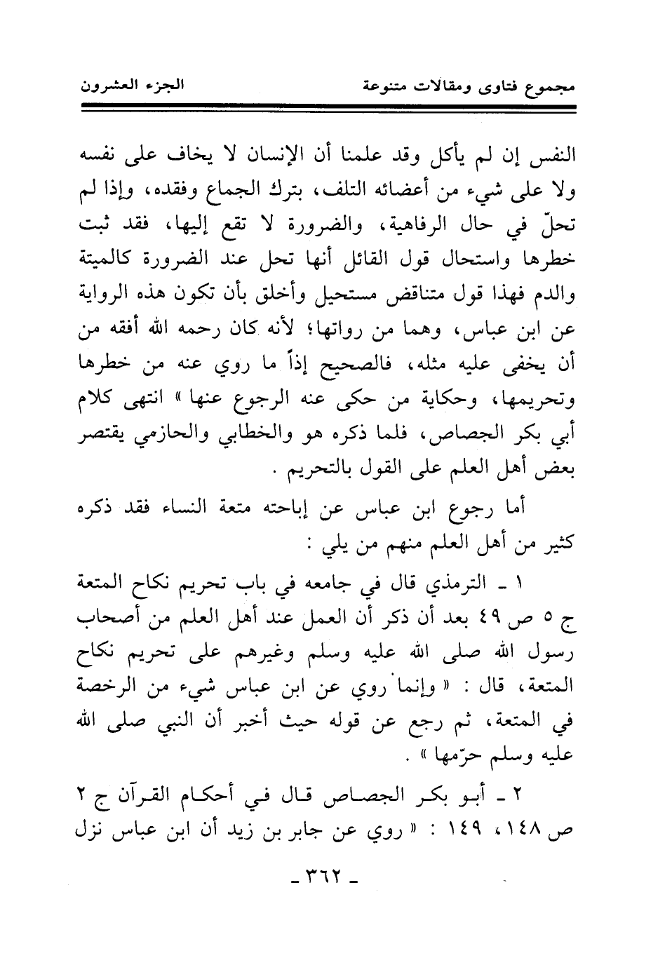 1 - الترمذي قال في جامعه في باب تحريم نكاح المتعة ج 5 ص 49 بعد أن ذكر أن العمل عند أهل العلم من أصحاب رسول الله صلى الله عليه وسلم وغيرهم على تحريم نكاح المتعة، قال: " وإنما روي عن ابن عباس شيء من الرخصة في المتعة، ثم رجع عن قوله حيث أخبر أن النبي صلى الله عليه وسلم حرمها ".
