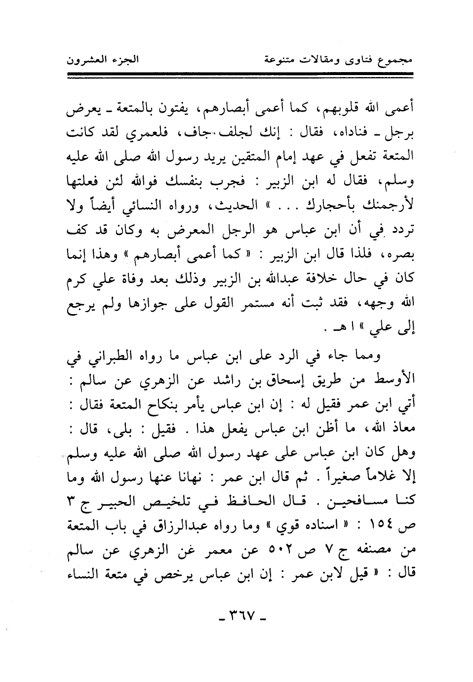 ومما جاء في الرد على ابن عباس ما رواه الطبراني في الأوسط من طريق إسحاق بن راشد عن الزهري عن سالم: «أتي ابن عمر فقيل له: إن ابن عباس يأمر بنكاح المتعة فقال: معاذ الله، ما أظن ابن عباس يفعل هذا. فقيل: بلى، قال: وهل كان ابن عباس على عهد رسول الله صلى الله عليه وسلم إلا غلاما صغيرا. ثم قال ابن عمر: نهانا عنها رسول الله وما كنا مسافحين» . قال الحافظ في تلخيص الحبير ج 3 ص 154: " إسناده قوي " وما رواه عبد الرزاق في باب المتعة من مصنفه ج 7 ص 502 عن معمر عن الزهري عن سالم قال: " قيل لابن عمر: إن ابن عباس يرخص في متعة النساء
