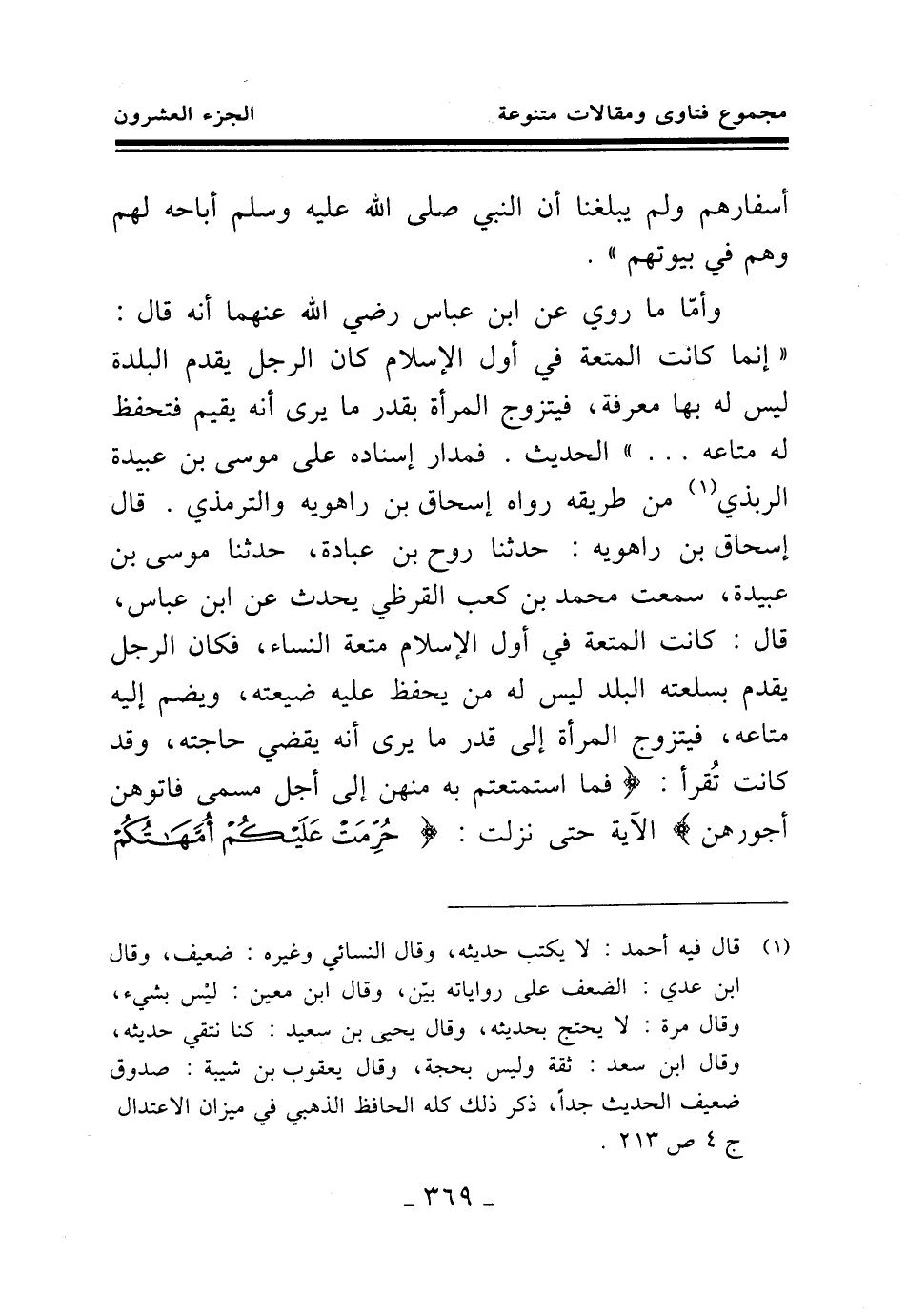 وأما ما روي عن ابن عباس رضي الله عنهما أنه قال: " إنما كانت المتعة في أول الإسلام كان الرجل يقدم البلدة ليس له بها معرفة، فيتزوج المرأة بقدر ما يرى أنه يقيم فتحفظ له متاعه. . . " الحديث. فمدار إسناده على موسى بن عبيدة الربذي من طريقه رواه إسحاق بن راهويه والترمذي. قال إسحاق بن راهويه: حدثنا روح بن عبادة، حدثنا موسى بن عبيدة، سمعت محمد بن كعب القرظي يحدث عن ابن عباس، قال: كانت المتعة في أول الإسلام متعة النساء، فكان الرجل يقدم بسلعته البلد ليس له من يحفظ عليه ضيعته، ويضم إليه متاعه، فيتزوج المرأة إلى قدر ما يرى أنه يقضي حاجته، وقد كانت تقرأ: " فما استمتعتم به منهن إلى أجل مسمى فآتوهن أجورهن " الآية حتى نزلت: {حُرِّمَتْ عَلَيْكُمْ أُمَّهَاتُكُمْ وَبَنَاتُكُمْ} (¬1)