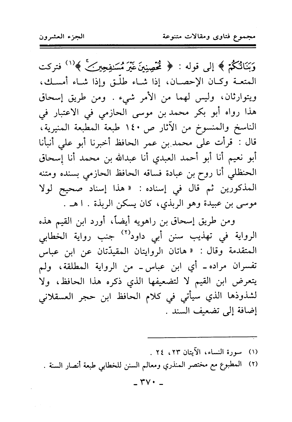 إلى قوله: {مُحْصِنِينَ غَيْرَ مُسَافِحِينَ} (¬1) فتركت المتعة وكان الإحصان، إذا شاء طلق وإذا شاء أمسك، ويتوارثان، وليس لهما من الأمر شيء. ومن طريق إسحاق هذا رواه أبو بكر محمد بن موسى الحازمي في الاعتبار في الناسخ والمنسوخ من الآثار ص 140 طبعة المطبعة المنيرية، قال: قرأت على محمد بن عمر الحافظ أخبرنا أبو علي أنبأنا أبو نعيم أنا أبو أحمد العبدي أنا عبد الله بن محمد أنا إسحاق الحنظلي أنا روح بن عبادة فساقه الحافظ الحازمي بسنده ومتنه المذكورين ثم قال في إسناده: " هذا إسناد صحيح لولا موسى بن عبيدة وهو الربذي، كان يسكن الربذة ". اهـ.