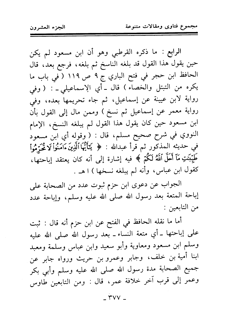 الرابع: ما ذكره القرطبي وهو أن ابن مسعود لم يكن حين يقول هذا القول قد بلغه الناسخ ثم بلغه، فرجع بعد، قال الحافظ ابن حجر في فتح الباري ج 9 ص 119 (في باب ما يكره من التبتل والخصاء) قال - أي الإسماعيلي -: (وفي رواية لابن عيينة عن إسماعيل، ثم جاء تحريمها بعده، وفي رواية معمر عن إسماعيل ثم نسخ) وممن مال إلى القول بأن ابن مسعود حين كان يقول هذا القول لم يبلغه النسخ، الإمام النووي في شرح صحيح مسلم، قال: (وقوله أي ابن مسعود في حديثه المذكور ثم قرأ عبد الله: {يَا أَيُّهَا الَّذِينَ آمَنُوا لَا تُحَرِّمُوا طَيِّبَاتِ مَا أَحَلَّ اللَّهُ لَكُمْ} (¬1) فيه إشارة إلى أنه كان يعتقد إباحتها، كقول ابن عباس، وأنه لم يبلغه نسخها) اهـ.