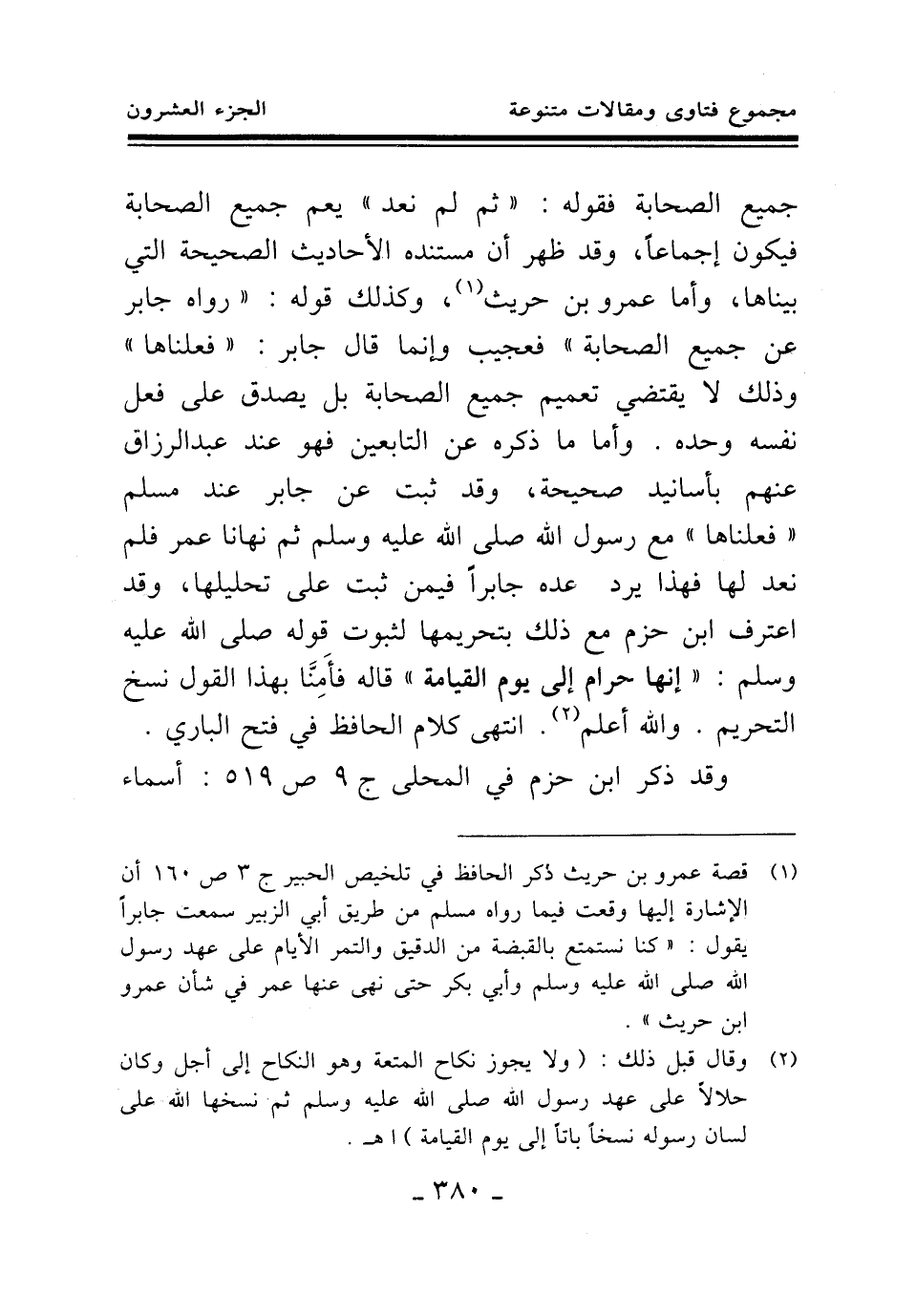 جميع الصحابة فقوله: " ثم لم نعد " يعم جميع الصحابة فيكون إجماعا، وقد ظهر أن مستنده الأحاديث الصحيحة التي بيناها، وأما عمرو بن حريث، وكذلك قوله: " رواه جابر عن جميع الصحابة " فعجيب وإنما قال جابر: " فعلناها " وذلك لا يقتضي تعميم جميع الصحابة بل يصدق على فعل نفسه وحده. وأما ما ذكره عن التابعين فهو عند عبد الرزاق عنهم بأسانيد صحيحة، وقد ثبت عن جابر عند مسلم " فعلناها " مع رسول الله صلى الله عليه وسلم ثم نهانا عمر فلم نعد لها فهذا يرد، عده جابرا فيمن ثبت على تحليلها، وقد اعترف ابن حزم مع ذلك بتحريمها لثبوت قوله صلى الله عليه وسلم: «إنها حرام إلى يوم القيامة (¬1) » قاله فأمنا بهذا القول نسخ التحريم. والله أعلم. انتهى كلام الحافظ في فتح الباري.