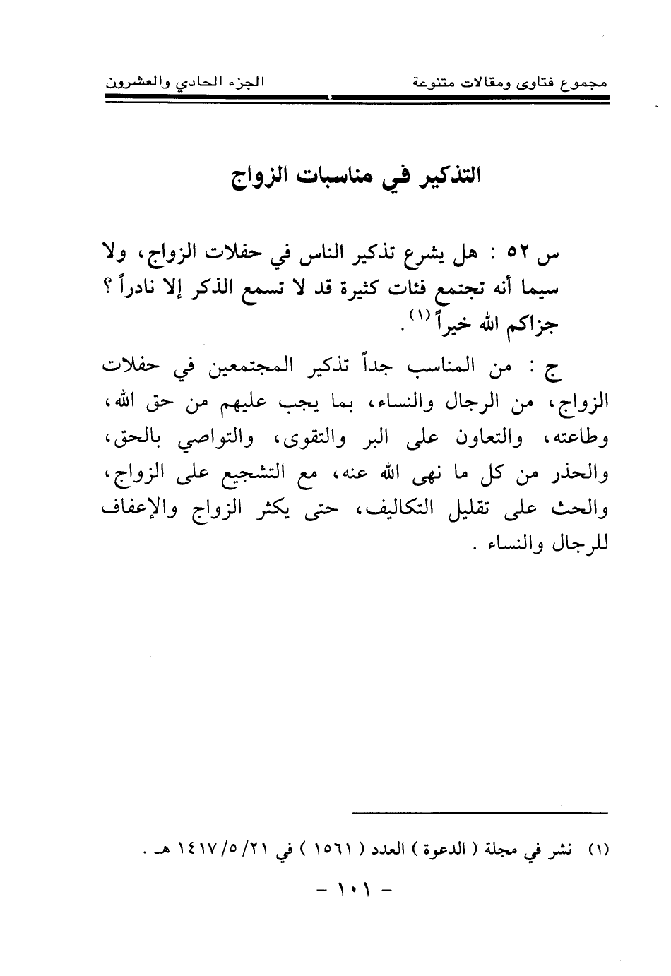 س 52: هل يشرع تذكير الناس في حفلات الزواج، ولا سيما أنه تجتمع فئات كثيرة قد لا تسمع الذكر إلا نادرا؟ جزاكم الله خيرا (¬1)