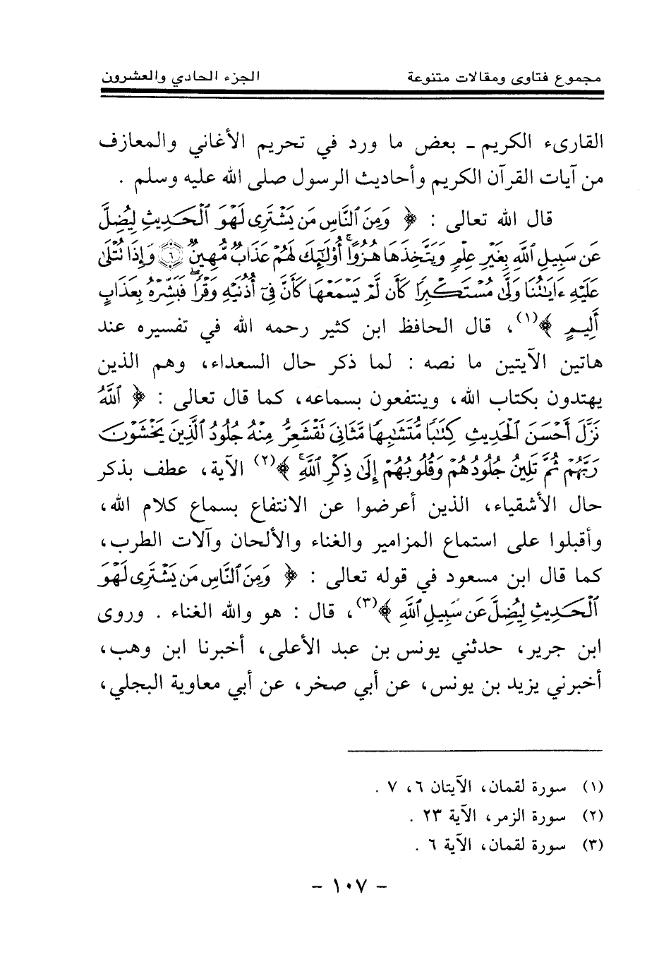 القارئ الكريم - بعض ما ورد في تحريم الأغاني والمعازف من آيات القرآن الكريم وأحاديث الرسول صلى الله عليه وسلم. قال الله تعالى: {وَمِنَ النَّاسِ مَنْ يَشْتَرِي لَهْوَ الْحَدِيثِ لِيُضِلَّ عَنْ سَبِيلِ اللَّهِ بِغَيْرِ عِلْمٍ وَيَتَّخِذَهَا هُزُوًا أُولَئِكَ لَهُمْ عَذَابٌ مُهِينٌ} (¬1) {وَإِذَا تُتْلَى عَلَيْهِ آيَاتُنَا وَلَّى مُسْتَكْبِرًا كَأَنْ لَمْ يَسْمَعْهَا كَأَنَّ فِي أُذُنَيْهِ وَقْرًا فَبَشِّرْهُ بِعَذَابٍ أَلِيمٍ} (¬2) قال الحافظ ابن كثير رحمه الله في تفسيره عند هاتين الآيتين ما نصه: لما ذكر حال السعداء، وهم الذين يهتدون بكتاب الله، وينتفعون بسماعه، كما قال تعالى: {اللَّهُ نَزَّلَ أَحْسَنَ الْحَدِيثِ كِتَابًا مُتَشَابِهًا مَثَانِيَ تَقْشَعِرُّ مِنْهُ جُلُودُ الَّذِينَ يَخْشَوْنَ رَبَّهُمْ ثُمَّ تَلِينُ جُلُودُهُمْ وَقُلُوبُهُمْ إِلَى ذِكْرِ اللَّهِ} (¬3) الآية، عطف بذكر حال الأشقياء، الذين أعرضوا عن الانتفاع بسماع كلام الله، وأقبلوا على استماع المزامير والغناء والألحان وآلات الطرب، كما قال ابن مسعود في قوله تعالى: {وَمِنَ النَّاسِ مَنْ يَشْتَرِي لَهْوَ الْحَدِيثِ لِيُضِلَّ عَنْ سَبِيلِ اللَّهِ} (¬4) قال: هو والله الغناء. وروى ابن جرير، حدثني يونس بن عبد الأعلى، أخبرنا ابن وهب، أخبرني يزيد بن يونس، عن أبي صخر، عن أبي معاوية البجلي،