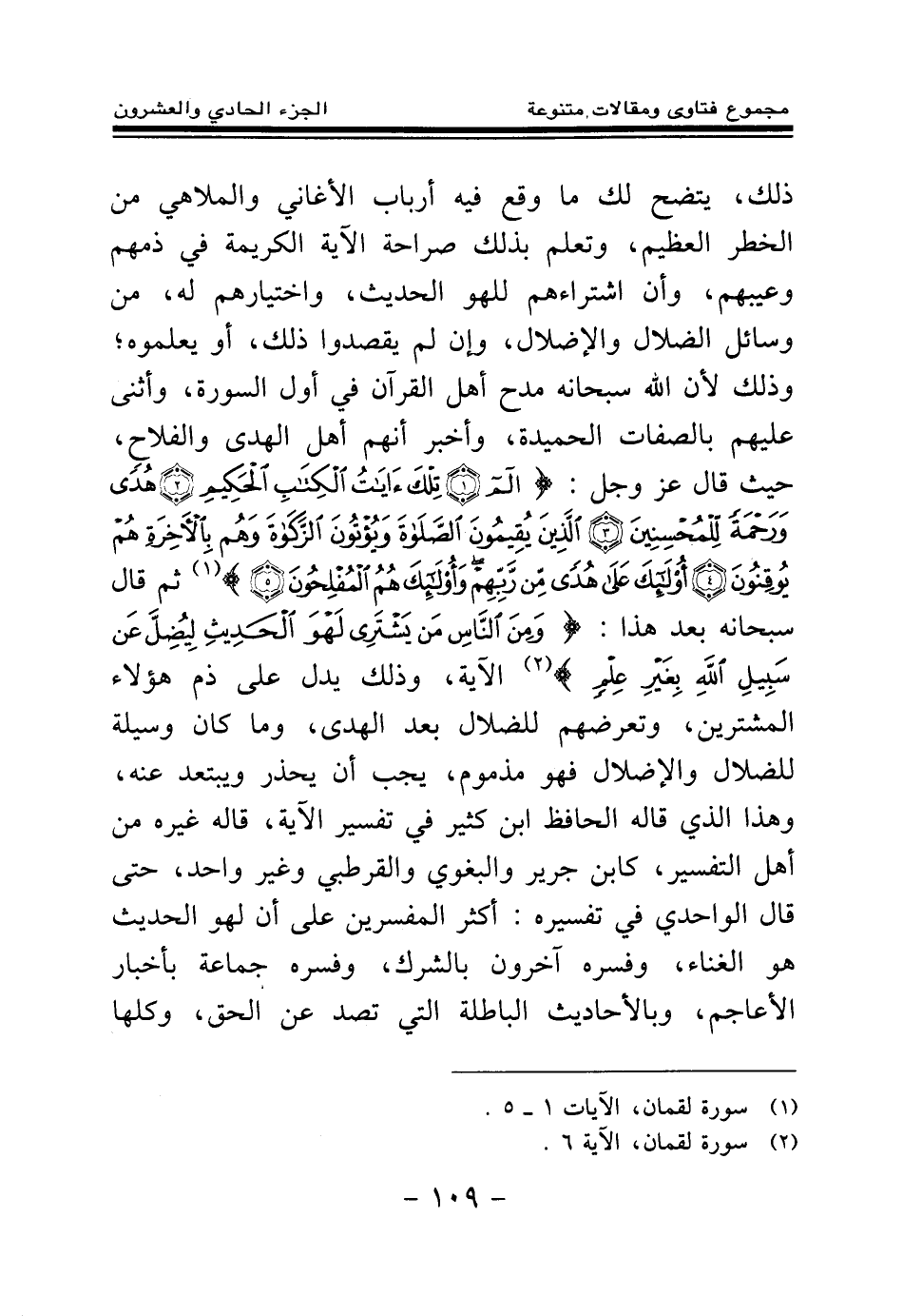 ذلك، يتضح لك ما وقع فيه أرباب الأغاني والملاهي من الخطر العظيم، وتعلم بذلك صراحة الآية الكريمة في ذمهم وعيبهم، وأن اشتراءهم للهو الحديث، واختيارهم له، من وسائل الضلال والإضلال، وإن لم يقصدوا ذلك، أو يعلموه؛ وذلك لأن الله سبحانه مدح أهل القرآن في أول السورة، وأثنى عليهم بالصفات الحميدة، وأخبر أنهم أهل الهدى والفلاح، حيث قال عز وجل: {الم} (¬1) {تِلْكَ آيَاتُ الْكِتَابِ الْحَكِيمِ} (¬2) {هُدًى وَرَحْمَةً لِلْمُحْسِنِينَ} (¬3) {الَّذِينَ يُقِيمُونَ الصَّلَاةَ وَيُؤْتُونَ الزَّكَاةَ وَهُمْ بِالْآخِرَةِ هُمْ يُوقِنُونَ} (¬4) {أُولَئِكَ عَلَى هُدًى مِنْ رَبِّهِمْ وَأُولَئِكَ هُمُ الْمُفْلِحُونَ} (¬5) ثم قال سبحانه بعد هذا: {وَمِنَ النَّاسِ مَنْ يَشْتَرِي لَهْوَ الْحَدِيثِ لِيُضِلَّ عَنْ سَبِيلِ اللَّهِ بِغَيْرِ عِلْمٍ} (¬6) الآية، وذلك يدل على ذم هؤلاء المشترين، وتعرضهم للضلال بعد الهدى، وما كان وسيلة للضلال والإضلال فهو مذموم، يجب أن يحذر ويبتعد عنه، وهذا الذي قاله الحافظ ابن كثير في تفسير الآية، قاله غيره من أهل التفسير، كابن جرير والبغوي والقرطبي وغير واحد، حتى قال الواحدي في تفسيره: أكثر المفسرين على أن لهو الحديث هو الغناء، وفسره آخرون بالشرك، وفسره جماعة بأخبار الأعاجم، وبالأحاديث الباطلة التي تصد عن الحق، وكلها