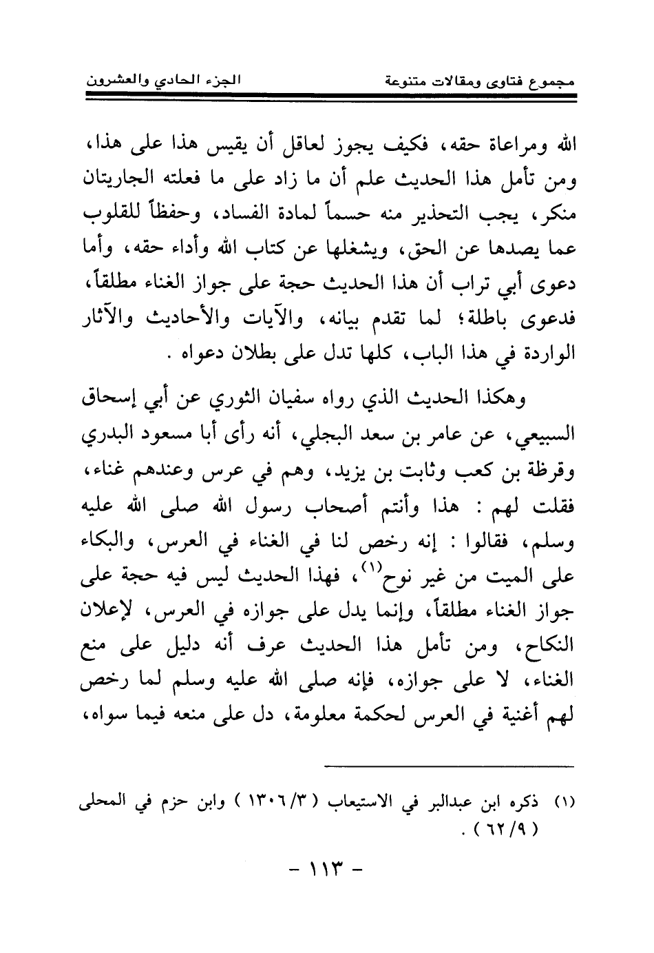 وهكذا الحديث الذي رواه سفيان الثوري عن أبي إسحاق السبيعي، عن عامر بن سعد البجلي، أنه رأى أبا مسعود البدري وقرظة بن كعب وثابت بن يزيد، وهم في عرس وعندهم غناء، فقلت لهم: هذا وأنتم أصحاب رسول الله صلى الله عليه وسلم، فقالوا: «إنه رخص لنا في الغناء في العرس، والبكاء على الميت من غير نوح (¬1) » ، فهذا الحديث ليس فيه حجة على جواز الغناء مطلقا، وإنما يدل على جوازه في العرس، لإعلان النكاح، ومن تأمل هذا الحديث عرف أنه دليل على منع الغناء، لا على جوازه، فإنه صلى الله عليه وسلم لما رخص لهم أغنية في العرس لحكمة معلومة، دل على منعه فيما سواه