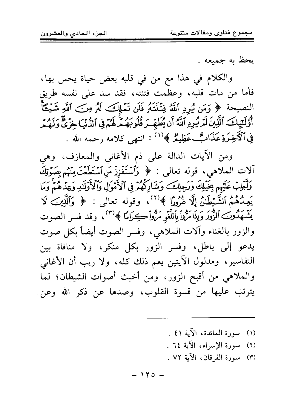 ومن الآيات الدالة على ذم الأغاني والمعازف، وهي آلات الملاهي، قوله تعالى: {وَاسْتَفْزِزْ مَنِ اسْتَطَعْتَ مِنْهُمْ بِصَوْتِكَ وَأَجْلِبْ عَلَيْهِمْ بِخَيْلِكَ وَرَجِلِكَ وَشَارِكْهُمْ فِي الْأَمْوَالِ وَالْأَولَادِ وَعِدْهُمْ وَمَا يَعِدُهُمُ الشَّيْطَانُ إِلَّا غُرُورًا} (¬2) وقوله تعالى: {وَالَّذِينَ لَا يَشْهَدُونَ الزُّورَ وَإِذَا مَرُّوا بِاللَّغْوِ مَرُّوا كِرَامًا} (¬3) وقد فسر الصوت والزور بالغناء وآلات الملاهي، وفسر الصوت أيضا بكل صوت يدعو إلى باطل، وفسر الزور بكل منكر، ولا منافاة بين التفاسير، ومدلول الآيتين يعم ذلك كله، ولا ريب أن الأغاني والملاهي من أقبح الزور، ومن أخبث أصوات الشيطان؛ لما يترتب عليها من قسوة القلوب، وصدها عن ذكر الله وعن