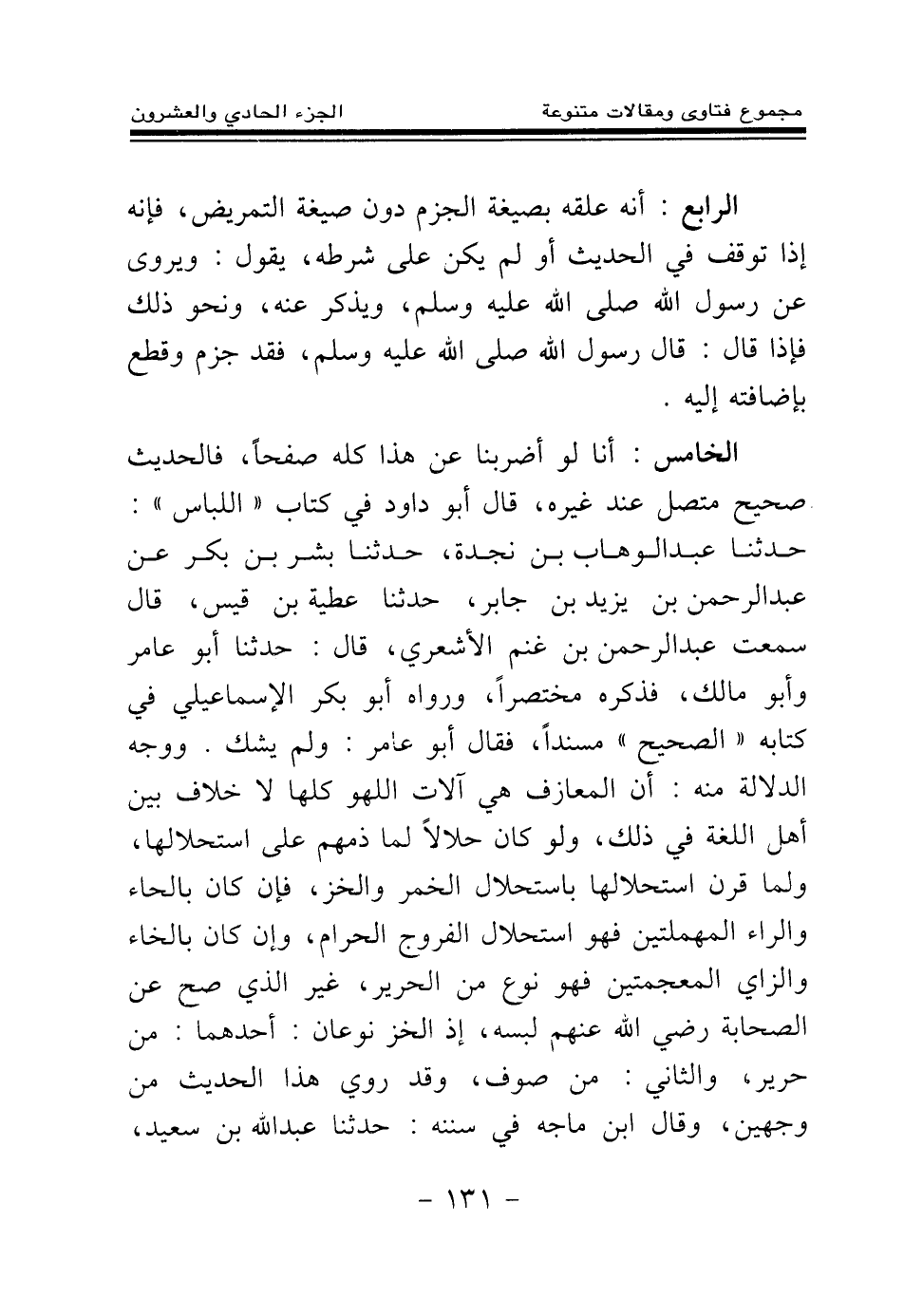 الخامس: أنا لو أضربنا عن هذا كله صفحا، فالحديث صحيح متصل عند غيره، قال أبو داود في كتاب " اللباس ": حدثنا عبد الوهاب بن نجدة، حدثنا بشر بن بكر عن عبد الرحمن بن يزيد بن جابر، حدثنا عطية بن قيس، قال سمعت عبد الرحمن بن غنم الأشعري، قال: حدثنا أبو عامر وأبو مالك، فذكره مختصرا، ورواه أبو بكر الإسماعيلي في كتابه " الصحيح " مسندا، فقال أبو عامر: ولم يشك. ووجه الدلالة منه: أن المعازف هي آلات اللهو كلها لا خلاف بين أهل اللغة في ذلك، ولو كان حلالا لما ذمهم على استحلالها، ولما قرن استحلالها باستحلال الخمر والخز، فإن كان بالحاء والراء المهملتين فهو استحلال الفروج الحرام، وإن كان بالخاء والزاي المعجمتين فهو نوع من الحرير، غير الذي صح عن الصحابة رضي الله عنهم لبسه، إذ الخز نوعان: أحدهما: من حرير، والثاني: من صوف، وقد روي هذا الحديث من وجهين، وقال ابن ماجه في سننه: حدثنا عبد الله بن سعيد،