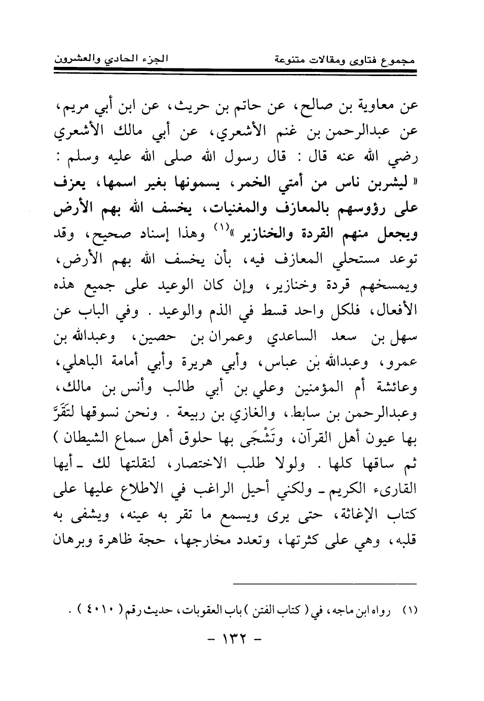 عن معاوية بن صالح، عن حاتم بن حريث، عن ابن أبي مريم، عن عبد الرحمن بن غنم الأشعري، عن أبي مالك الأشعري رضي الله عنه قال: قال رسول الله صلى الله عليه وسلم: «ليشربن ناس من أمتي الخمر، يسمونها بغير اسمها، يعزف على رءوسهم بالمعازف والمغنيات، يخسف الله بهم الأرض ويجعل منهم القردة والخنازير (¬1) » . وهذا إسناد صحيح، وقد توعد مستحلي المعازف فيه، بأن يخسف الله بهم الأرض، ويمسخهم قردة وخنازير، وإن كان الوعيد على جميع هذه الأفعال، فلكل واحد قسط في الذم والوعيد. وفي الباب عن سهل بن سعد الساعدي وعمران بن حصين، وعبد الله بن عمرو، وعبد الله بن عباس، وأبي هريرة وأبي أمامة الباهلي، وعائشة أم المؤمنين وعلي بن أبي طالب وأنس بن مالك، وعبد الرحمن بن سابط، والغازي بن ربيعة. ونحن نسوقها لتقر بها عيون أهل القرآن، وتشجى بها حلوق أهل سماع الشيطان) ثم ساقها كلها. ولولا طلب الاختصار، لنقلتها لك- أيها القارئ الكريم- ولكني أحيل الراغب في الاطلاع عليها على كتاب الإغاثة، حتى يرى ويسمع ما تقر به عينه، ويشفى به قلبه، وهي على كثرتها، وتعدد مخارجها، حجة ظاهرة وبرهان