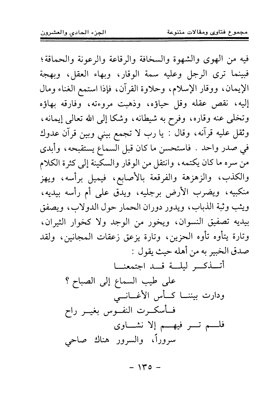 فيه من الهوى والشهوة والسخافة والرقاعة والرعونة والحماقة؛ فبينما ترى الرجل وعليه سمة الوقار، وبهاء العقل، وبهجة الإيمان، ووقار الإسلام، وحلاوة القرآن، فإذا استمع الغناء ومال إليه، نقص عقله وقل حياؤه، وذهبت مروءته، وفارقه بهاؤه وتخلى عنه وقاره، وفرح به شيطانه، وشكا إلى الله تعالى إيمانه، وثقل عليه قرآنه، وقال: يا رب لا تجمع بيني وبين قرآن عدوك في صدر واحد. فاستحسن ما كان قبل السماع يستقبحه، وأبدى من سره ما كان يكتمه، وانتقل من الوقار والسكينة إلى كثرة الكلام والكذب، والزهزهة والفرقعة بالأصابع، فيميل برأسه، ويهز منكبيه، ويضرب الأرض برجليه، ويدق على أم رأسه بيديه، ويثب وثبة الذباب، ويدور دوران الحمار حول الدولاب، ويصفق بيديه تصفيق النسوان، ويخور من الوجد ولا كخوار الثيران، وتارة يتأوه تأوه الحزين، وتارة يزعق زعقات المجانين، ولقد صدق الخبير به من أهله حيث يقول: