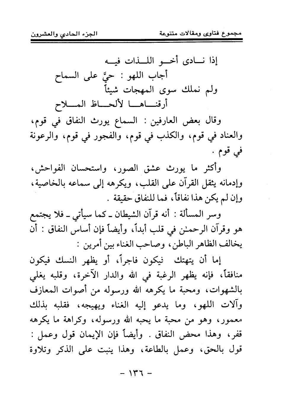 إما أن يتهتك فيكون فاجرا، أو يظهر النسك فيكون منافقا، فإنه يظهر الرغبة في الله والدار الآخرة، وقلبه يغلي بالشهوات، ومحبة ما يكرهه الله ورسوله من أصوات المعازف وآلات اللهو، وما يدعو إليه الغناء ويهيجه، فقلبه بذلك معمور، وهو من محبة ما يحبه الله ورسوله، وكراهة ما يكرهه قفر، وهذا محض النفاق. وأيضا فإن الإيمان قول وعمل: قول بالحق، وعمل بالطاعة، وهذا ينبت على الذكر وتلاوة