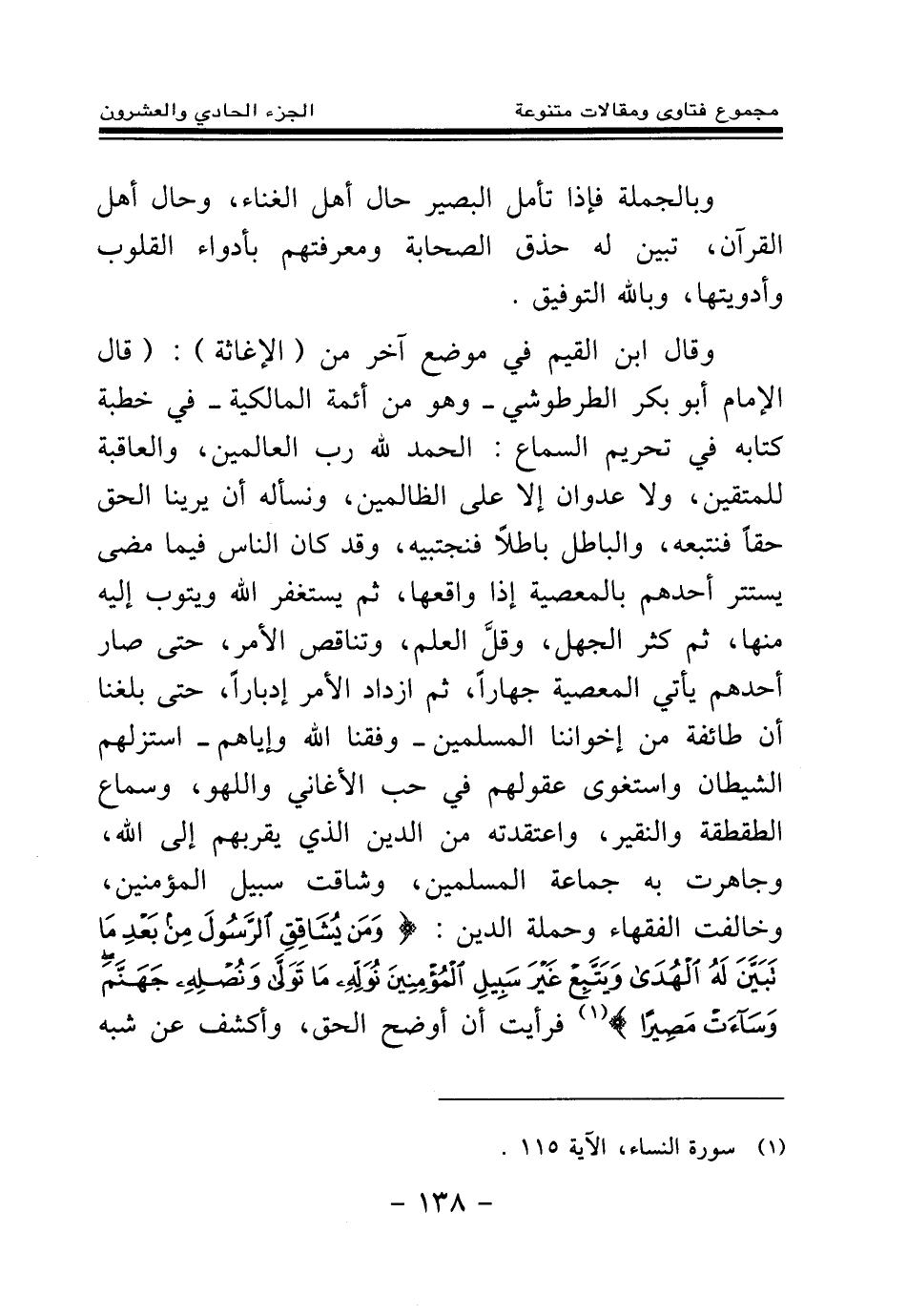 وقال ابن القيم في موضع آخر من (الإغاثة) : (قال الإمام أبو بكر الطرطوشي - وهو من أئمة المالكية - في خطبة كتابه في تحريم السماع: الحمد لله رب العالمين، والعاقبة للمتقين، ولا عدوان إلا على الظالمين، ونسأله أن يرينا الحق حقا فنتبعه، والباطل باطلا فنجتبيه، وقد كان الناس فيما مضى يستتر أحدهم بالمعصية إذا واقعها، ثم يستغفر الله ويتوب إليه منها، ثم كثر الجهل، وقل العلم، وتناقص الأمر، حتى صار أحدهم يأتي المعصية جهارا، ثم ازداد الأمر إدبارا، حتى بلغنا أن طائفة من إخواننا المسلمين- وفقنا الله وإياهم- استزلهم الشيطان واستغوى عقولهم في حب الأغاني واللهو، وسماع الطقطقة والنقير، واعتقدته من الدين الذي يقربهم إلى الله، وجاهرت به جماعة المسلمين، وشاقت سبيل المؤمنين، وخالفت الفقهاء وحملة الدين: {وَمَنْ يُشَاقِقِ الرَّسُولَ مِنْ بَعْدِ مَا تَبَيَّنَ لَهُ الْهُدَى وَيَتَّبِعْ غَيْرَ سَبِيلِ الْمُؤْمِنِينَ نُوَلِّهِ مَا تَوَلَّى وَنُصْلِهِ جَهَنَّمَ وَسَاءَتْ مَصِيرًا} (¬1) فرأيت أن أوضح الحق، وأكشف عن شبه