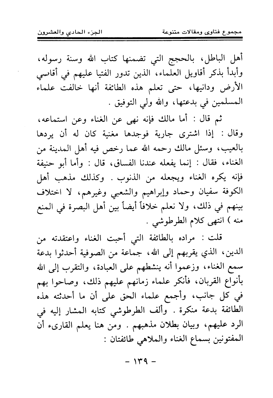 قلت: مراده بالطائفة التي أحبت الغناء واعتقدته من الدين، الذي يقربهم إلى الله، جماعة من الصوفية أحدثوا بدعة سمع الغناء، وزعموا أنه ينشطهم على العبادة، والتقرب إلى الله بأنواع القربان، فأنكر علماء زمانهم عليهم ذلك، وصاحوا بهم في كل جانب، وأجمع علماء الحق على أن ما أحدثته هذه الطائفة بدعة منكرة. وألف الطرطوشي كتابه المشار إليه في الرد عليهم، وبيان بطلان مذهبهم. ومن هنا يعلم القارئ أن المفتونين بسماع الغناء والملاهي طائفتان: