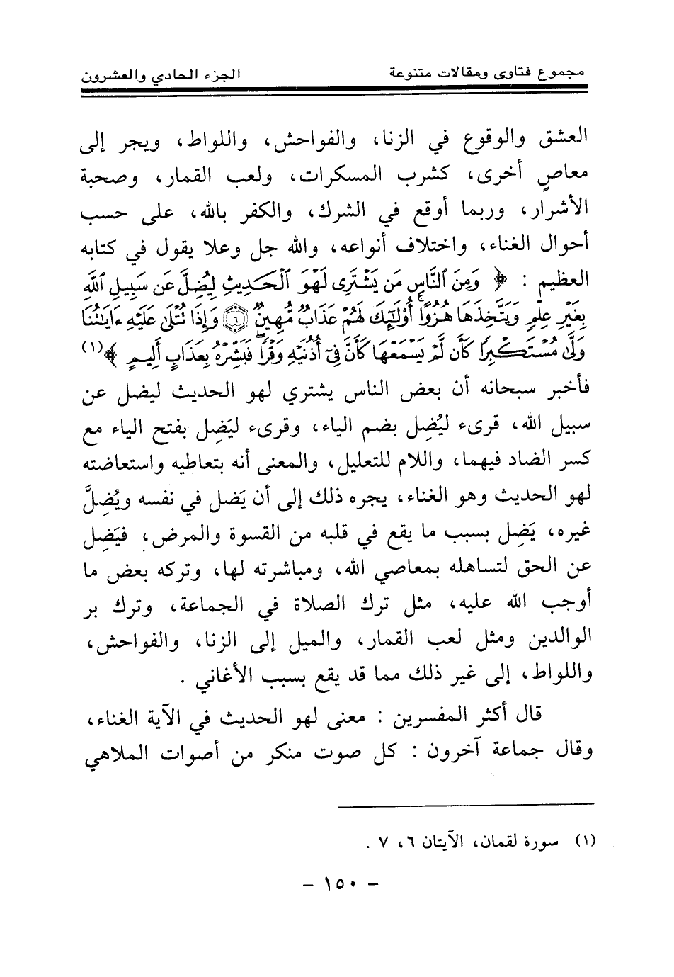 العشق والوقوع في الزنا والفواحش واللواط ويجر إلى معاص أخرى كشرب المسكرات ولعب القمار وصحبة الأشرار، وربما أوقع في الشرك والكفر بالله على حسب أحوال الغناء واختلاف أنواعه، والله جل وعلا يقول في كتابه العظيم {وَمِنَ النَّاسِ مَنْ يَشْتَرِي لَهْوَ الْحَدِيثِ لِيُضِلَّ عَنْ سَبِيلِ اللَّهِ بِغَيْرِ عِلْمٍ وَيَتَّخِذَهَا هُزُوًا أُولَئِكَ لَهُمْ عَذَابٌ مُهِينٌ} (¬1) {وَإِذَا تُتْلَى عَلَيْهِ آيَاتُنَا وَلَّى مُسْتَكْبِرًا كَأَنْ لَمْ يَسْمَعْهَا كَأَنَّ فِي أُذُنَيْهِ وَقْرًا فَبَشِّرْهُ بِعَذَابٍ أَلِيمٍ} (¬2)