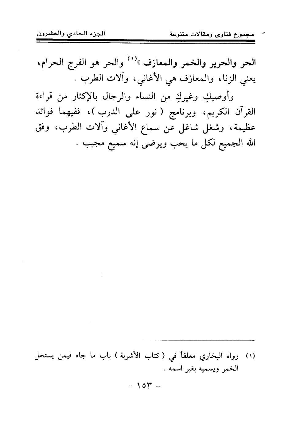 الحر والحرير والخمر والمعازف (¬1) » والحر هو: الفرج الحرام - يعني الزنا - والمعازف هي: الأغاني وآلات الطرب.