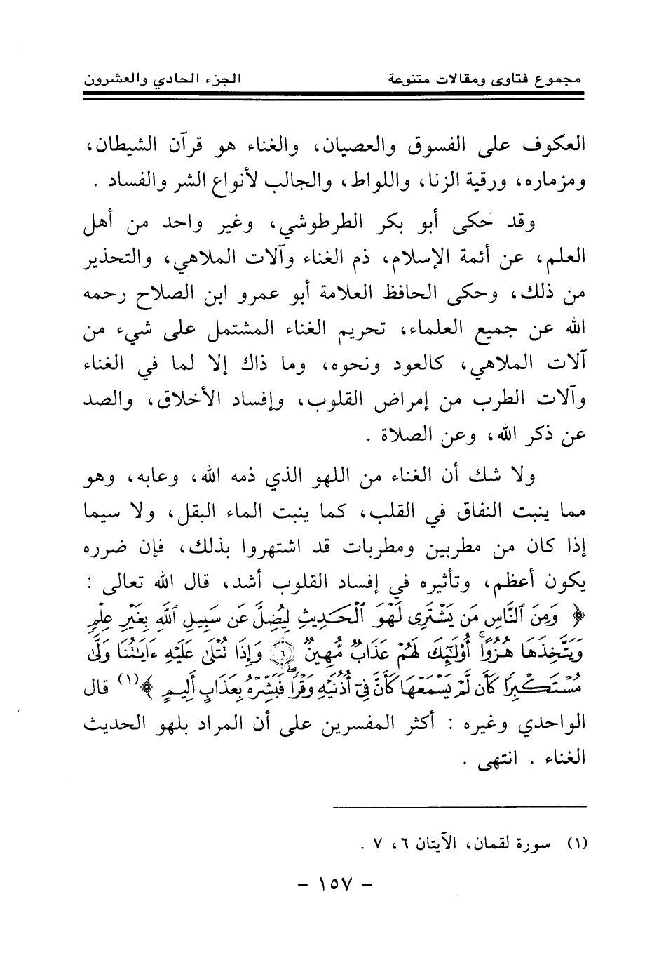 وقد حكى أبو بكر الطرطوشي وغير واحد من أهل العلم عن أئمة الإسلام ذم الغناء وآلات الملاهي والتحذير من ذلك، وحكى الحافظ العلامة أبو عمرو بن الصلاح رحمه الله عن جميع العلماء تحريم الغناء المشتمل على شيء من آلات الملاهي كالعود ونحوه وما ذاك إلا لما في الغناء وآلات الطرب من إمراض القلوب وإفساد الأخلاق والصد عن ذكر الله وعن الصلاة، ولا شك أن الغناء من اللهو الذي ذمه الله وعابه، وهو مما ينبت النفاق في القلب كما ينبت الماء البقل، ولا سيما إذا كان من مطربين ومطربات قد اشتهروا بذلك فإن ضرره يكون أعظم وتأثيره في إفساد القلوب أشد، قال الله تعالى: {وَمِنَ النَّاسِ مَنْ يَشْتَرِي لَهْوَ الْحَدِيثِ لِيُضِلَّ عَنْ سَبِيلِ اللَّهِ بِغَيْرِ عِلْمٍ وَيَتَّخِذَهَا هُزُوًا أُولَئِكَ لَهُمْ عَذَابٌ مُهِينٌ} (¬1) {وَإِذَا تُتْلَى عَلَيْهِ آيَاتُنَا وَلَّى مُسْتَكْبِرًا كَأَنْ لَمْ يَسْمَعْهَا كَأَنَّ فِي أُذُنَيْهِ وَقْرًا فَبَشِّرْهُ بِعَذَابٍ أَلِيمٍ} (¬2) قال: الواحدي وغيره: (أكثر المفسرين على أن المراد بلهو الحديث: الغناء انتهى) .