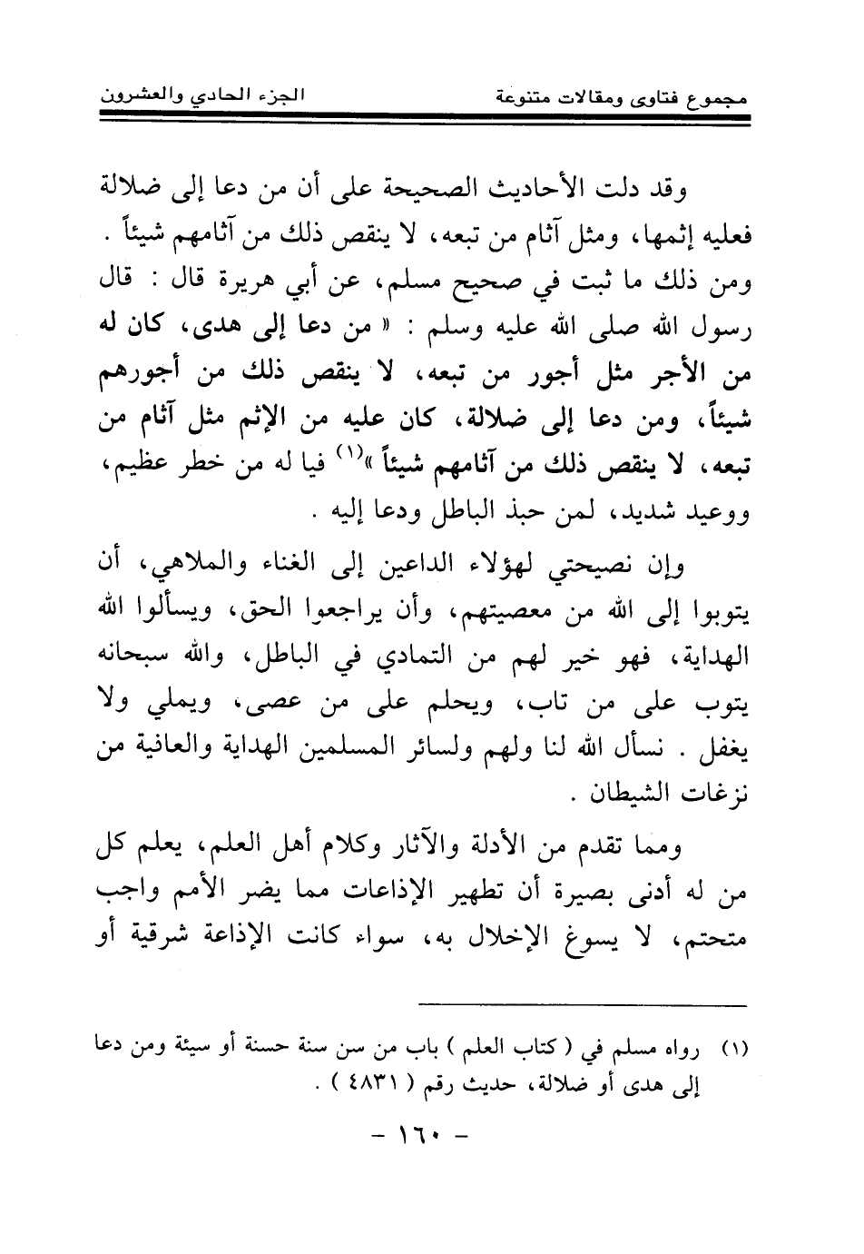 ودعا إليه وإن نصيحتي لهؤلاء الداعين إلى الغناء والملاهي أن يتوبوا إلى الله من معصيتهم وأن يراجعوا الحق ويسألوا الله الهداية فهو خير لهم من التمادي في الباطل والله سبحانه يتوب على من تاب ويحلم على من عصى ويملي ولا يغفل.