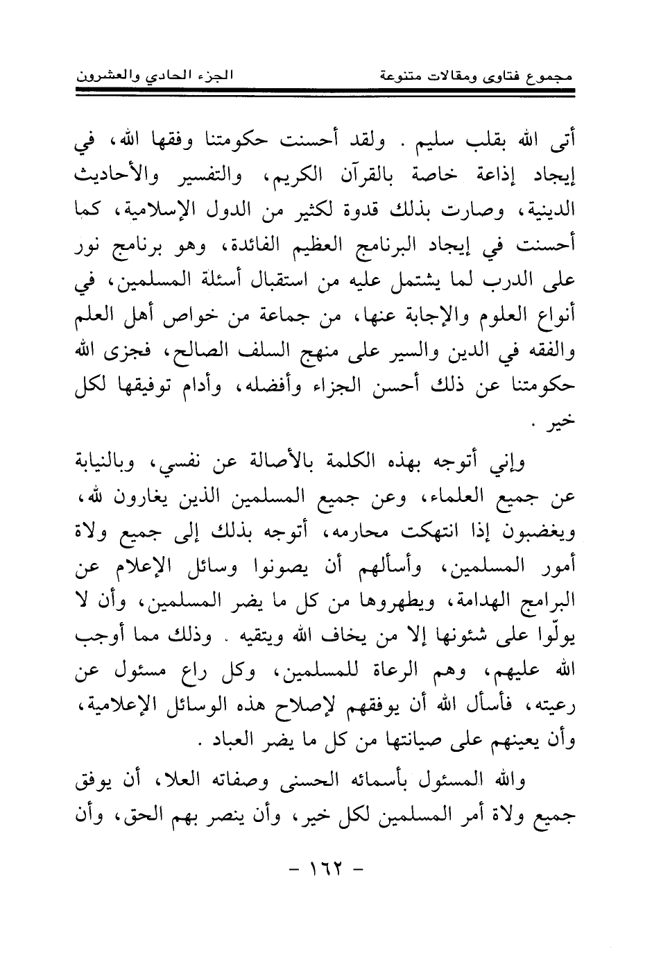 ولقد أحسنت حكومتنا وفقها الله في إيجاد إذاعة خاصة بالقرآن الكريم والتفسير والأحاديث الدينية، وصارت بذلك قدوة لكثير من الدول الإسلامية، كما أحسنت في إيجاد البرنامج العظيم الفائدة، وهو برنامج نور على الدرب لما يشتمل عليه من استقبال أسئلة المسلمين في أنواع العلوم والإجابة عليها من جماعة من خواص أهل العلم والفقه في الدين، والسير على منهج السلف الصالح، فجزى الله حكومتنا عن ذلك أحسن الجزاء وأفضله وأدام توفيقها لكل خير وإني أتوجه بهذه الكلمة بالأصالة عن نفسي وبالنيابة عن جميع العلماء وعن جميع المسلمين الذين يغارون لله ويغضبون إذا انتهكت محارمه، أتوجه بذلك إلى جميع ولاة أمور المسلمين وأسألهم أن يصونوا وسائل الإعلام عن البرامج الهدامة ويطهروها من كل ما يضر المسلمين وأن لا يولوا على شئونها إلا من يخاف الله ويتقيه، وذلك مما أوجب الله عليهم وهم الرعاة للمسلمين، وكل راع مسئول عن رعيته.