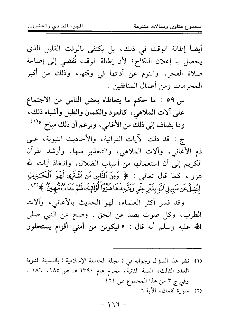 ج: قد دلت الآيات القرآنية والأحاديث النبوية على ذم الأغاني وآلات الملاهي والتحذير منها، وأرشد القرآن الكريم إلى أن استعمالها من أسباب الضلال واتخاذ آيات الله هزوا، كما قال تعالى: {وَمِنَ النَّاسِ مَنْ يَشْتَرِي لَهْوَ الْحَدِيثِ لِيُضِلَّ عَنْ سَبِيلِ اللَّهِ بِغَيْرِ عِلْمٍ وَيَتَّخِذَهَا هُزُوًا أُولَئِكَ لَهُمْ عَذَابٌ مُهِينٌ} (¬1) وقد فسر أكثر العلماء لهو الحديث: بالأغاني وآلات الطرب وكل صوت يصد عن الحق وصح عن النبي صلى الله عليه وسلم أنه قال: «ليكونن من أمتي أقوام يستحلون