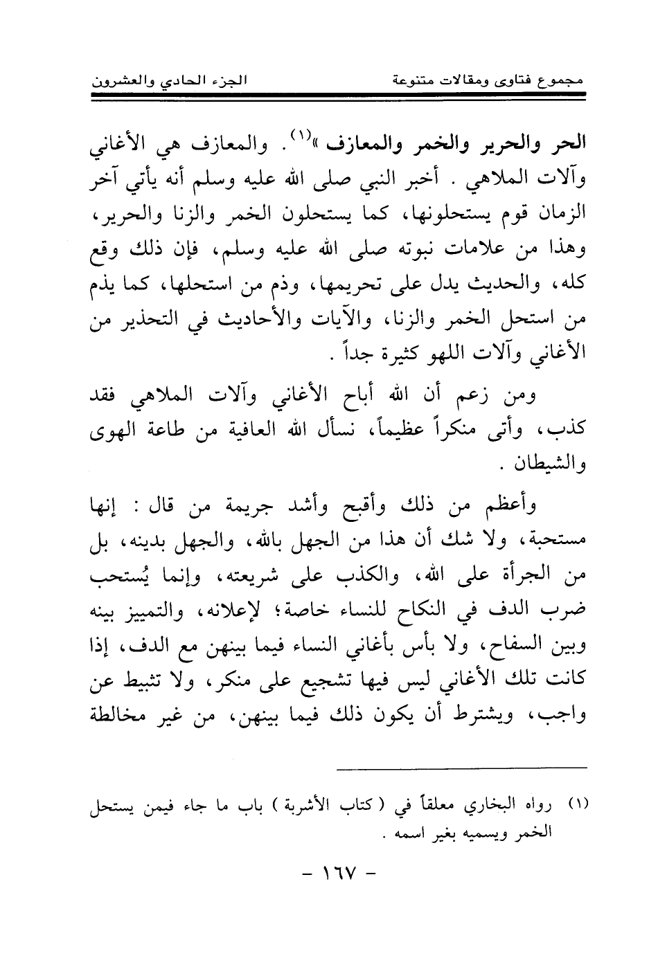 «أخبر النبي صلى الله عليه وسلم أنه يأتي آخر الزمان قوم يستحلونها كما يستحلون الخمر والزنا والحرير» وهذه من علامات نبوته صلى الله عليه وسلم فإن ذلك وقع كله، والحديث يدل على تحريمها وذم من استحلها، كما يذم من استحل الخمر والزنا، والآيات، والأحاديث في التحذير من الأغاني وآلات اللهو كثيرة جدا.