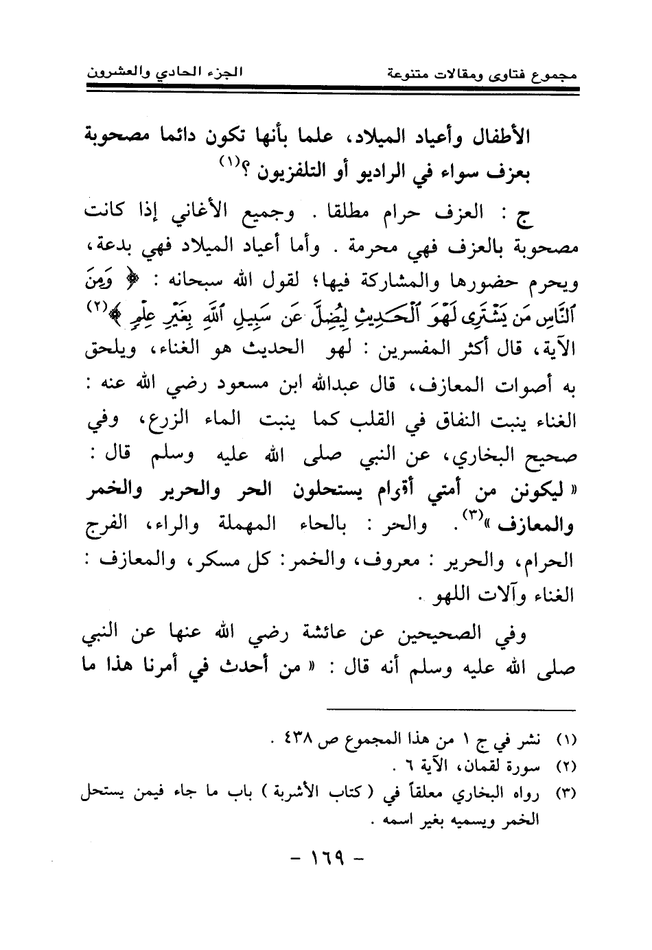 ج: العزف حرام مطلقا، وجميع الأغاني إذا كانت مصحوبة بالعزف فهي محرمة، وأما أعياد الميلاد فهي بدعة، ويحرم حضورها والمشاركة فيها لقول الله سبحانه: {وَمِنَ النَّاسِ مَنْ يَشْتَرِي لَهْوَ الْحَدِيثِ لِيُضِلَّ عَنْ سَبِيلِ اللَّهِ بِغَيْرِ عِلْمٍ} (¬2) الآية، قال أكثر المفسرين- لهو الحديث- هو الغناء ويلحق به أصوات المعازف، قال عبد الله بن مسعود رضي الله عنه: الغناء ينبت النفاق في القلب كما ينبت الماء الزرع، وفي صحيح البخاري عن النبي صلى الله عليه وسلم قال: «ليكونن من أمتي أقوام يستحلون الحر والحرير والخمر والمعازف (¬3) » والحر: بالحاء المهملة والراء الفرج الحرام، والحرير: معروف، والخمر: كل مسكر، والمعازف: الغناء وآلات اللهو، وفي الصحيحين عن عائشة رضي الله عنها عن النبي صلى الله عليه وسلم أنه قال: «من أحدث في أمرنا هذا ما