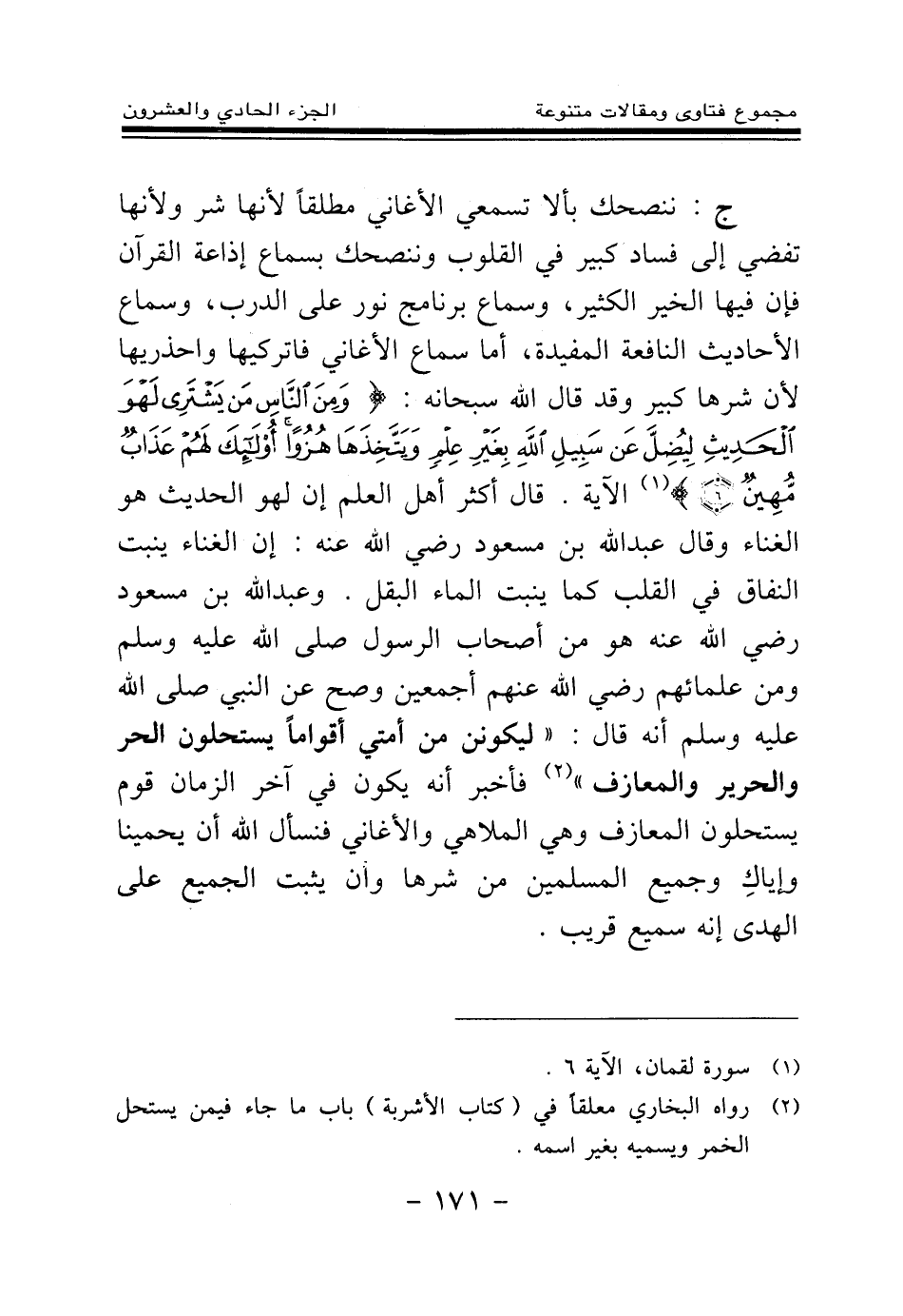 وعبد الله بن مسعود رضي الله عنه هو من أصحاب الرسول رضي الله عنه ومن علمائهم رضي الله عنهم أجمعين وصح عن النبي صلى الله عليه وسلم أنه قال: «ليكونن من أمتي أقواما يستحلون الحر والحرير والمعازف (¬2) » فأخبر أنه يكون في آخر الزمان قوم يستحلون المعازف وهي الملاهي والأغاني.