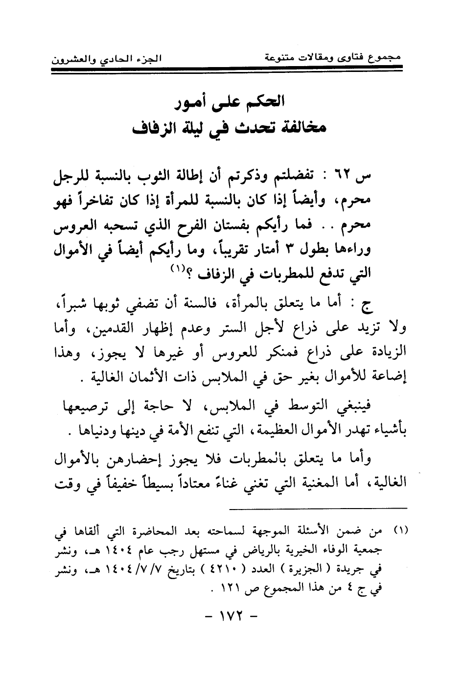 س 62: تفضلتم وذكرتم أن إطالة الثوب بالنسبة للرجل محرم، وأيضا إذا كان بالنسبة للمرأة إذا كان تفاخرا فهو محرم. فما رأيكم بفستان الفرح الذي تسحبه العروس وراءها بطول 3 أمتار تقريبا، وما رأيكم أيضا في الأموال التي تدفع للمطربات في الزفاف؟