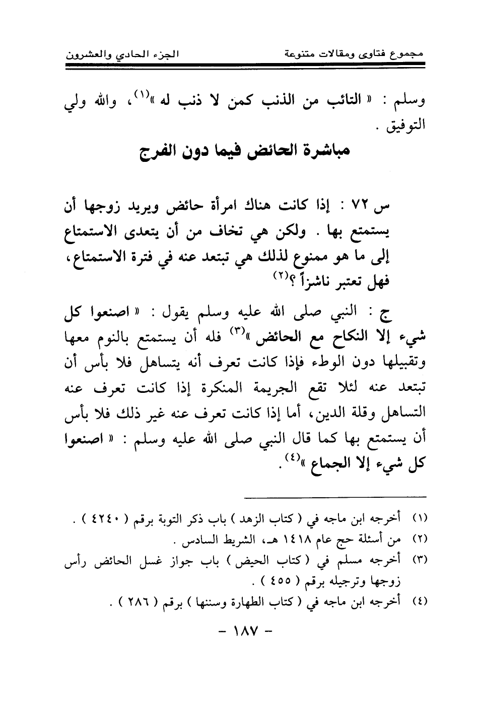 س 72: إذا كانت هناك امرأة حائض ويريد زوجها أن يستمتع بها. ولكن هي تخاف من أن يتعدى الاستمتاع إلى ما هو ممنوع لذلك هي تبتعد عنه في فترة الاستمتاع، فهل تعتبر ناشزا؟ (¬1) .