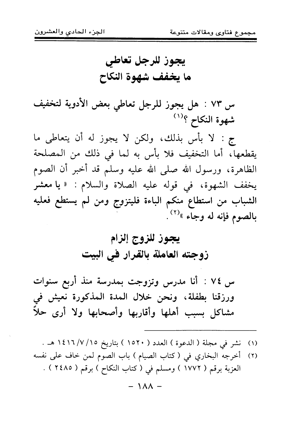 س 73: هل يجوز للرجل تعاطي بعض الأدوية لتخفيف شهوة النكاح؟ (¬1)