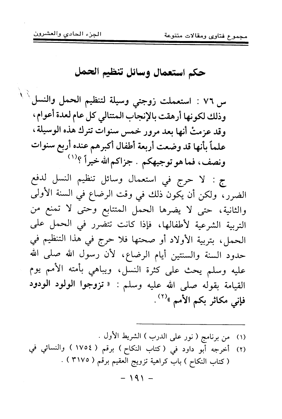 ج: لا حرج في استعمال وسائل تنظيم النسل، لدفع الضرر، ولكن أن يكون ذلك في وقت الرضاع في السنة الأولى والثانية، حتى لا يضرها الحمل المتتابع، وحتى لا تمنع من التربية الشرعية لأطفالها، فإذا كانت تتضرر في الحمل على الحمل بتربية الأولاد أو صحتها فلا حرج في هذا التنظيم في حدود السنة والسنتين أيام الرضاع؛ لأن رسول الله - صلى الله عليه وسلم - يحث على كثرة النسل، ويباهي بأمته الأمم يوم القيامة بقوله - صلى الله عليه ويسلم -: «تزوجوا الولود الودود فإني مكاثر بكم الأمم (¬2) » .