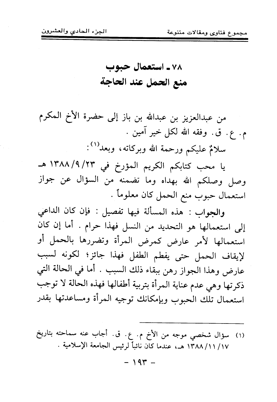 يا محب كتابكم الكريم المؤرخ في 23\9\1388هـ وصل وصلكم الله بهداه، وما تضمنه من السؤال عن جواز استعمال حبوب منع الحمل كان معلوما.