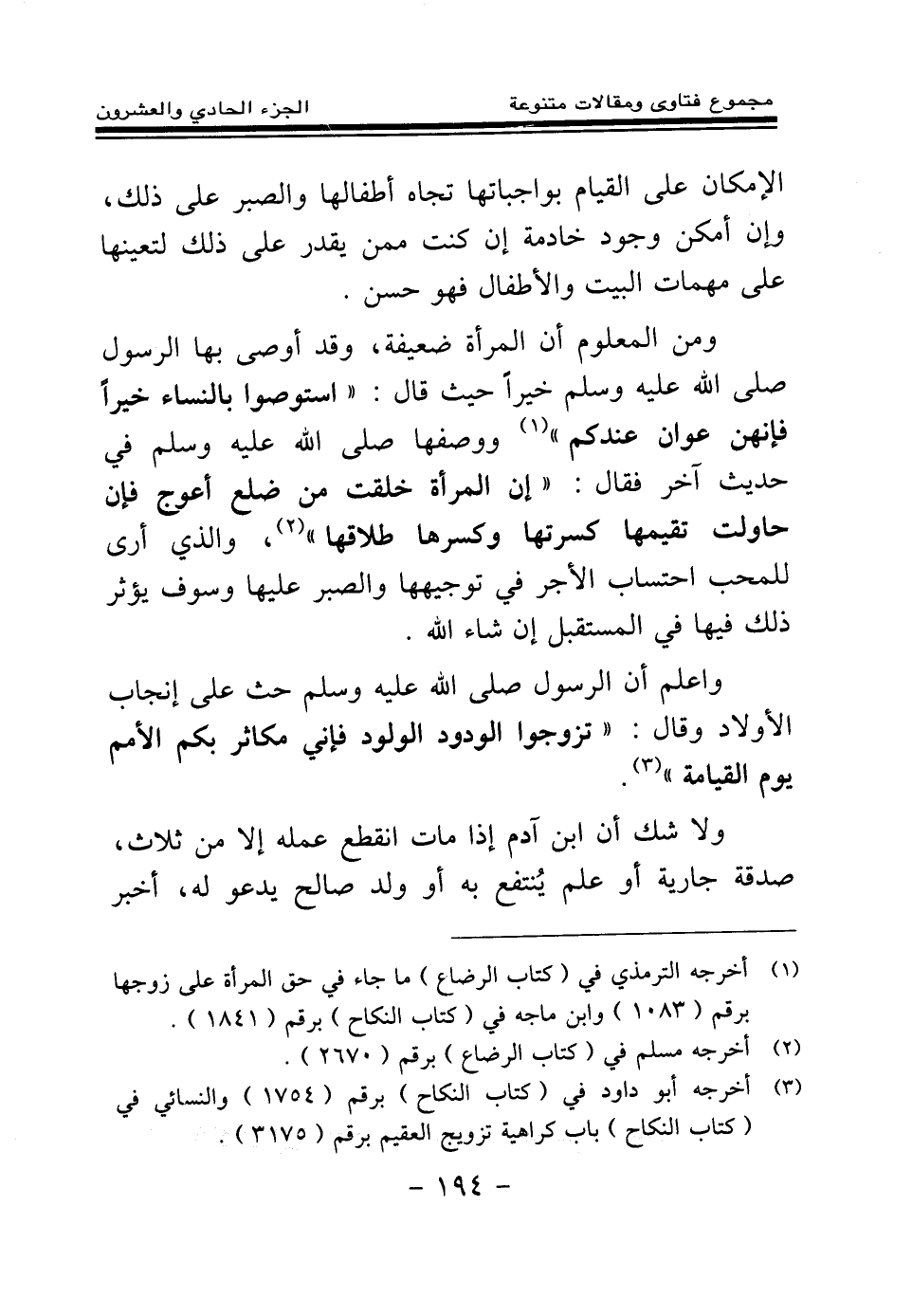 واعلم أن الرسول - صلى الله عليه وسلم - حث على إنجاب الأولاد وقال: «تزوجوا الودود الولود؛ فإني مكاثر بكم الأمم يوم القيامة (¬3) » .