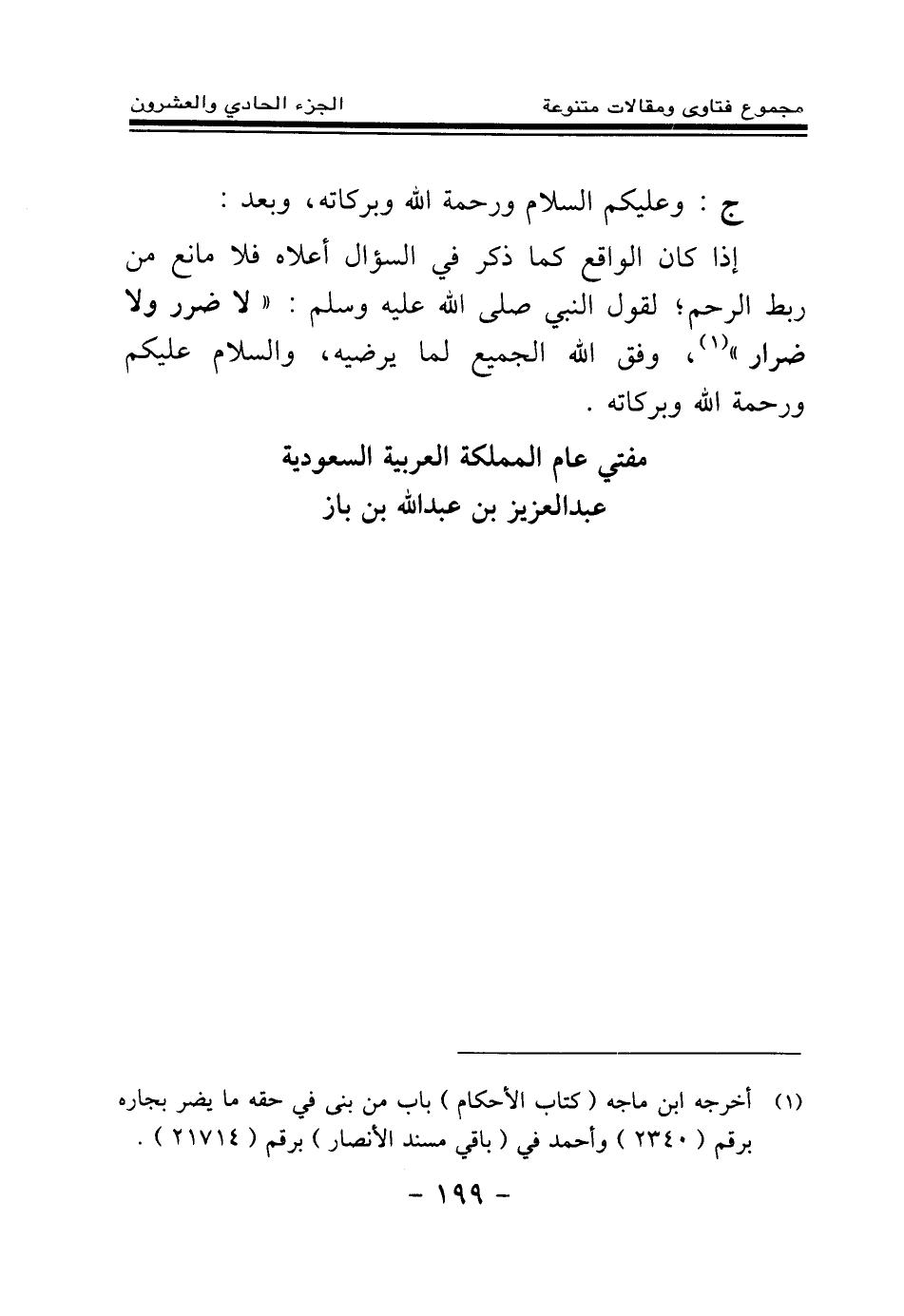 (¬1) أخرجه ابن ماجه (كتاب الأحكام) باب من بنى في حقه ما يضر بجاره برقم (2340) وأحمد في (باقي مسند الأنصار) برقم (21714) .