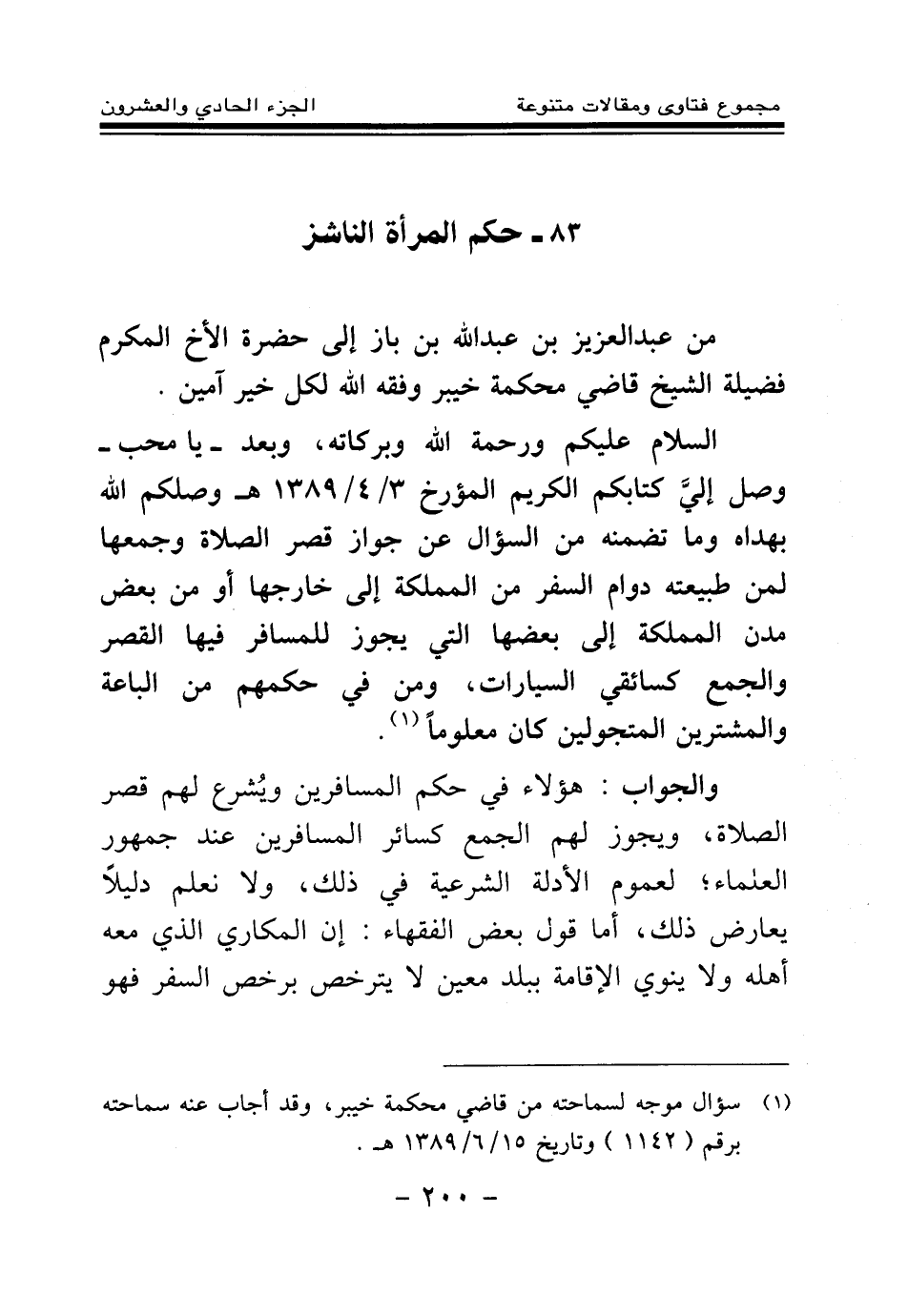 السلام عليكم ورحمة الله وبركاته، وبعد - يا محب - وصل إلي كتابكم الكريم المؤرخ 3\4\1389هـ وصلكم الله بهداه، وما تضمنه من السؤال عن جواز قصر الصلاة وجمعها لمن طبيعته دوام السفر من المملكة إلى خارجها، أو من بعض مدن المملكة إلى بعضها التي يجوز للمسافر فيها القصر والجمع، كسائقي السيارات، ومن في حكمهم من الباعة والمشترين المتجولين كان معلوما (¬1) .