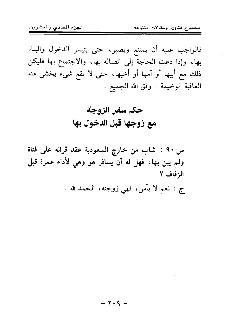 س 90: شاب من خارج السعودية عقد قرانه على فتاة ولم يبن بها، فهل له أن يسافر هو وهي لأداء عمرة قبل الزفاف؟